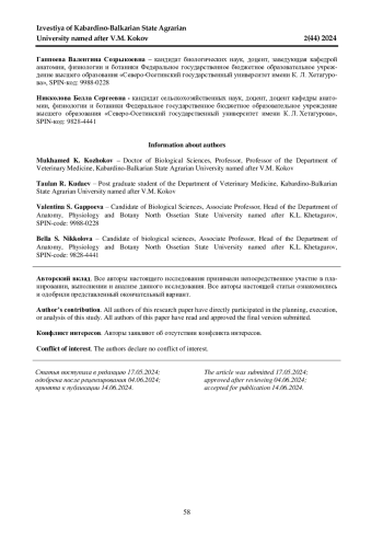 11. Морфологический и биохимический состав крови мясной птицы при применении в рационах биологически активных препаратов / Р. Б. Темираев, А. В. Каиров, Ф. Н. Цогоева, М. К. Кожоков, С. Ф. Ламартон, Е. А. Курбанова // Известия Горского государственного аграрного университета. 2019. Т. 56. №1. С. 91-97. EDN: VXHQTS