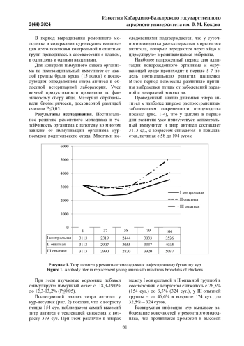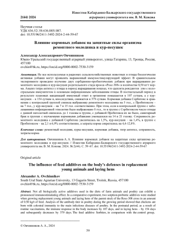 Не все используемые в рационах сельскохозяйственных животных и птицы биологически активные добавки могут проявлять выраженный иммуностимулирующий эффект. В сравнительном эксперименте проведено изучение двух сорбционно-пробиотических добавок при выращивании ремонтного молодняка и кур-несушек родительского стада кросса «Росс-308» в количестве 0,50 кг/т корма. Анализ титра антител у птицы в период выращивания показал, что цыплята рождаются уже с колостральным иммунитетом к основным инфекционным заболеваниям птицы. В постнатальный период в результате плановых вакцинаций иммунный ответ в организме повышается к 107 суткам, а у курнесушек - к 154 суткам и, впоследствии, снижается к 379 суткам. Кормовая добавка Сорбитокс в сравнении с контрольной группой снизила выбраковку ремонтного молодняка на 5 гол., с Пробитоксом - на 7 гол., у кур-несушек - на 7 и 15 гол. соответственно. При этом, если в контрольной группе с заболеваниями инфекционной этиологии было выбраковано 8 гол., то в группе с Сорбитоксом число птицы с данной патологией снизилось до 1 головы в группе, с добавкой Пробитокса их не было, санитарный брак в группах с изучаемыми кормовыми добавками уменьшился на 14 и 21 голову. Сохранность ремонтного молодняка с добавкой Сорбитокс увеличилась на 1,5%, кур-несушек - на 1,4%, в группе с Пробитоксом - на 2,1 и 6,9% соответственно, а затраты корма сократились на 4,4-12,8%.