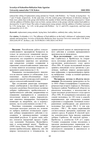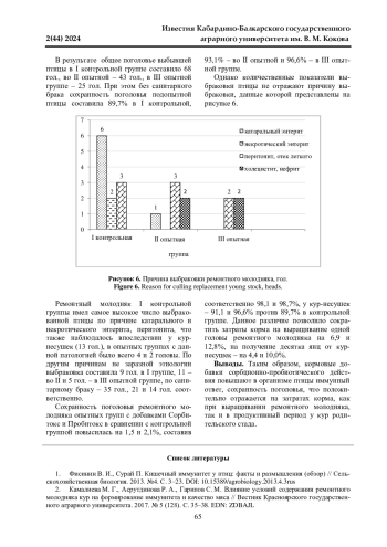 7. Овчинников А. А., Матросова Ю. В., Коновалов Д. А. Продуктивность ремонтного молодняка кур при использовании в рационе пробиотических кормовых добавок // Пермский аграрный вестник. 2018. № 4(24). С. 132-137. EDN: EVUEKW