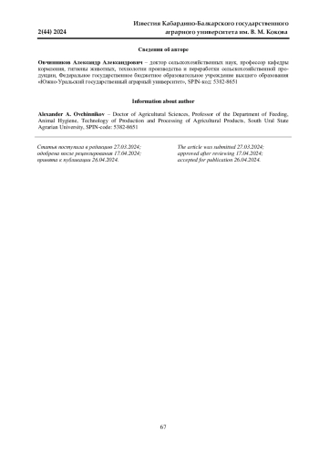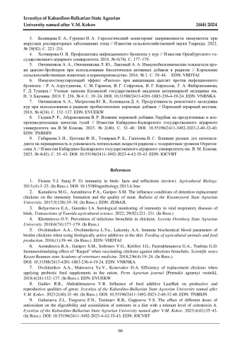 9. Габараева З. И., Цогоева Ф. Н., Темираев Р. Б., Гаппоева В. С. Влияние разных доз антиоксиданта на переваримость и усвояемость питательных веществ рациона с толерантным уровнем Охратоксина А // Известия Кабардино-Балкарского государственного аграрного университета им. В. М. Кокова. 2023. № 4(42). С. 35-43. DOI: 10.55196/2411-3492-2023-4-42-35-43 EDN: IOCVBT