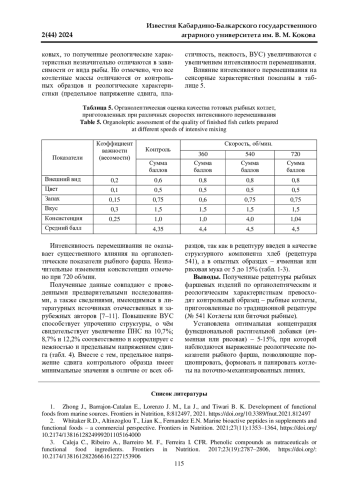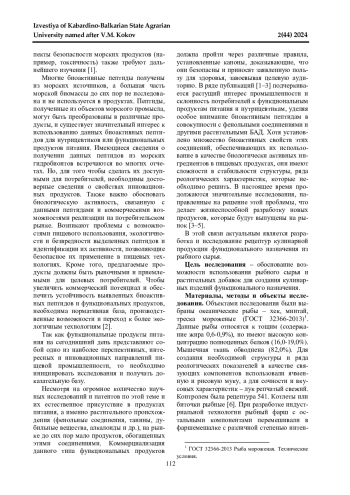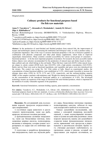 При производстве полуфабрикатов и готовых изделий из рыбных фаршей особую значимость приобретает совершенствование рецептур и технологий, направленных на повышение пищевой и биологической ценности, а также безопасности продуктов. Одним из способов повышения функциональных свойств является использование биоактивных пептидов в совокупности с фенольными соединениями и другими растительными БАД, что приводит к совершенствованию органолептических показателей. К важнейшим свойствам продукции многие ученые относят доступность для различных социальных групп потребителей - продуктов функциональной направленности. Для исследований выбраны наиболее доступные объекты морского промысла, рекомендуемые для изготовления фаршей и блюд на их основе - хек, минтай и треска, которые относятся к семейству тресковых. Данные рыбы имеют обводненную (0,82%) белую мышечную ткань, уникальны по калорийности (69-86 ккал), тощие (0,6-0,9%) с высокой концентрацией белка (16,0-19,0%). В качестве функциональных ингредиентов использованы ячменная и рисовая мука, а также в рецептуры введены овощи и специи. Контролем была рецептура №541. Котлеты или биточки рыбные. На основании экспериментальных исследований установлены концентрации растительных функциональных добавок - 5-15%, что позволило увеличить предельное напряжение сдвига (ПНС) на 10,7%, 8,7% и 12,2% соответственно, а влагоудерживающая способность (ВУС) образцов коррелирует с нежностью и ПНС. Потери массы при тепловой обработке составляют 20-21%, в зависимости от концентрации вводимой функциональной добавки в концентрации 5-10%. Разработанная технология обеспечивает расширение ассортимента функциональных рыбных полуфабрикатов, что является важным для питания социально незащищенных слоев населения.