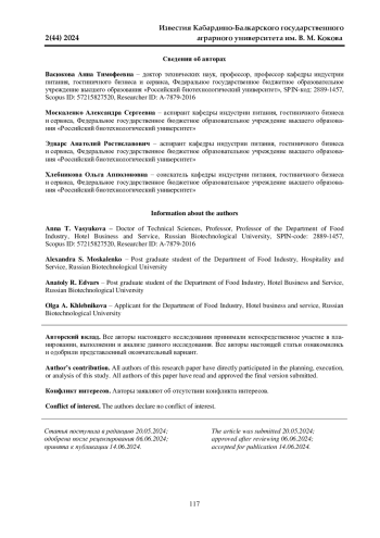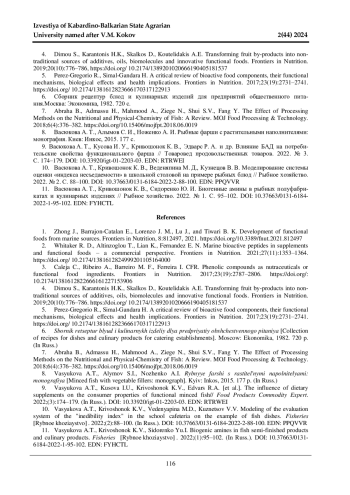 9. Васюкова А. Т., Кусова И. У., Кривошонок К. В., Эдварс Р. А. и др. Влияние БАД на потребительские свойства функционального фарша // Товаровед продовольственных товаров. 2022. № 3. С. 174-179. DOI: 10.33920/igt-01-2203-03 EDN: RTRWEI