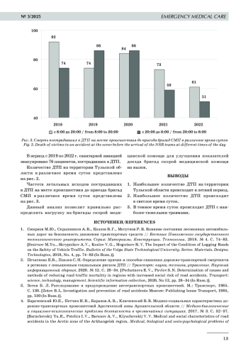 Цель исследования: оценить влияние метеорологических факторов и времени суток на количество вызванных ДТП для разработки, внедрения и оценки эффективности новых организационных технологий медицинского обеспечения. Материалы и методы исследования. Отчеты о работе территориального центра медицины катастроф (ТЦМК) Тульской области, учетные формы, заполняемые специалистами ТЦМК в информационной системе «Мониторинг центров медицины катастроф» (smk. minzdrav. gov. ru); отчетные формы отраслевого статистического наблюдения №№ 55 и 56 «Сведения о деятельности медицинских организаций, осуществляющих оказание экстренной медицинской помощи и проведение медицинской эвакуации при выездных формах работы, в том числе имеющих отделения экстренной консультативной медицинской помощи» за 2018–2022 гг. Методы исследования: аналитический, статистический. Результаты и их обсуждение. Выполнен сравнительный анализ показателей количества дорожно- транспортных пришествий в зависимости от времени суток, времени года на территории Тульской области.