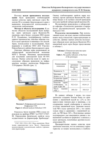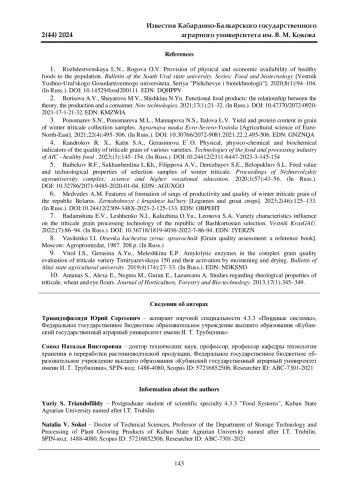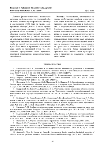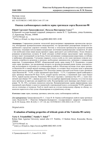 ТРИАНДОФИЛИДИ Ю. С., СОКОЛ Н. В. ОЦЕНКА ХЛЕБОПЕКАРНЫХ СВОЙСТВ ЗЕРНА ТРИТИКАЛЕ СОРТА ВАЛЕНТИН-90 // ИЗВЕСТИЯ КАБАРДИНО-БАЛКАРСКОГО ГОСУДАРСТВЕННОГО АГРАРНОГО УНИВЕРСИТЕТА ИМ. В. М. КОКОВА. 2024. № 2 (44)