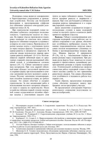 9. Перевозников Б. Ф. Новые прогрессивные решения по применению габионных конструкций в дорожно-мостовом строительстве // Автомобильные дороги: Информ. сб. / Информавтодор, 1999. Вып. 6. 10. Пат. 2336389 Российская Федерация; МПК E02B 3/12. Способ возведения подпорных стенок из габионов / С. О. Курбанов, К. С. Курбанов, А. А. Созаев; заявитель и патентообладатель Общество с ограниченной ответственностью Научно-производственная фирма “Берег”. № 2006127239/03; заявл. 26.07.2006; опубл. 20.10.2008, Бюл. № 29.
