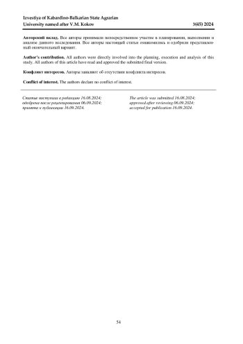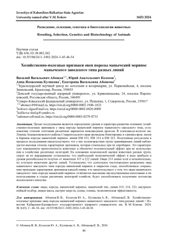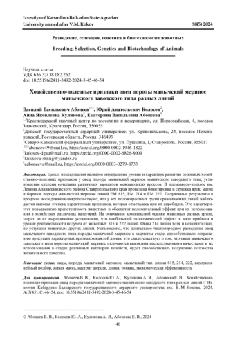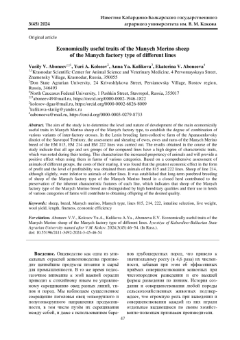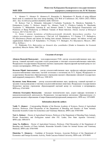 10. Kolosov Yuri A., Klimenko Aleksander I., Vasilenko Vyacheslav N., Shirokova Nadezhda V., Getmantseva Lyubov V., Kolosov Anatoli Yu., Aboneev Vasili V., Chizhova Ludmila N., Marchenko Vyacheslav V., MikhailenkoAntonina K. and Aboneev Dmitri V. Some Biological Characteristics and Prediction of Sheep Productivity at Different Variants of Breed Selection // OnLine Journal of Biological Sciences. 2017. 17(4). S. 343-347. EDN: XXEXGP