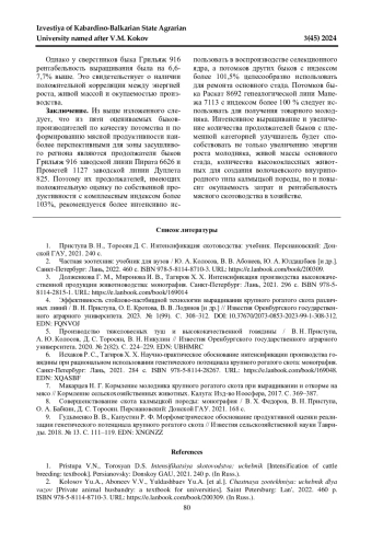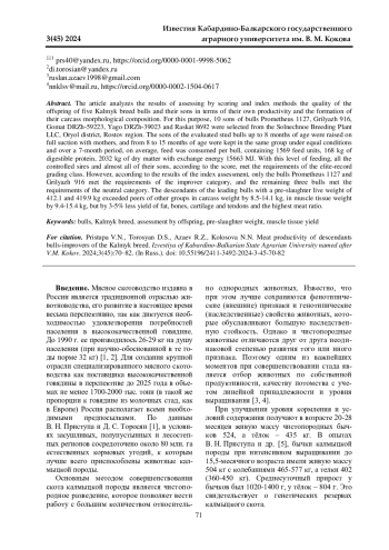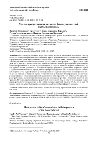 ПРИСТУПА В. Н., ТОРОСЯН Д. С., АЗАЕВ Р. З., КОЛОСОВА Н. Н. МЯСНАЯ ПРОДУКТИВНОСТЬ ПОТОМКОВ БЫКОВ-УЛУЧШАТЕЛЕЙ КАЛМЫЦКОЙ ПОРОДЫ // ИЗВЕСТИЯ КАБАРДИНО-БАЛКАРСКОГО ГОСУДАРСТВЕННОГО АГРАРНОГО УНИВЕРСИТЕТА ИМ. В. М. КОКОВА. 2024. № 3 (45)