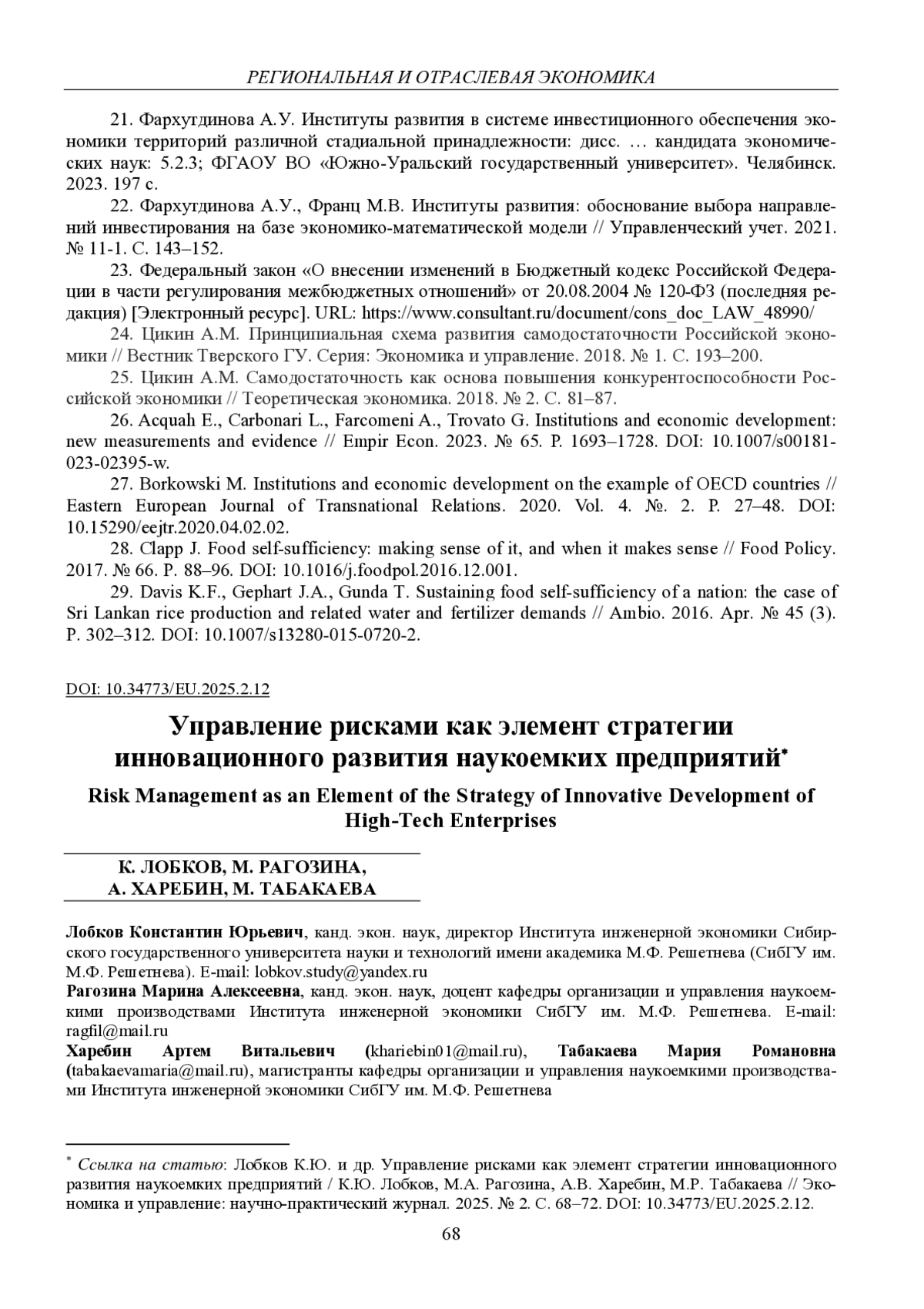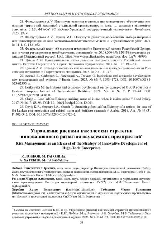 ЛОБКОВ К. Ю., РАГОЗИНА М. А., ХАРЕБИН А. В., ТАБАКАЕВА М. Р. УПРАВЛЕНИЕ РИСКАМИ КАК ЭЛЕМЕНТ СТРАТЕГИИ ИННОВАЦИОННОГО РАЗВИТИЯ НАУКОЕМКИХ ПРЕДПРИЯТИЙ // ЭКОНОМИКА И УПРАВЛЕНИЕ: НАУЧНО-ПРАКТИЧЕСКИЙ ЖУРНАЛ. 2025. № 2 (182)