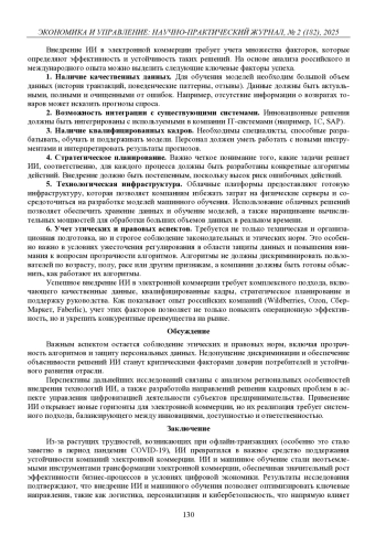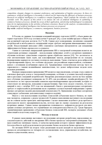 Электронная коммерция стала одним из ключевых драйверов глобальной экономики, демонстрируя устойчивый рост даже в условиях кризисов. Однако стремительное развитие отрасли сопровождается рядом вызовов: высокой конкуренцией, динамичным изменением потребительских предпочтений, оптимизацией логистических процессов. В этих условиях искусственный интеллект становится критически важным инструментом для повышения эффективности бизнес-процессов. Исследования по искусственному интеллекту в электронной коммерции остаются фрагментарными, что подтверждает актуальность данной научной работы. Целью данной статьи является анализ роли искусственного интеллекта в оптимизации бизнес-процессов электронной коммерции, выявление ключевых направлений их применения, а также разработка методических рекомендаций по его внедрению в деятельность бизнес-структур. На основе проведенного анализа предложены рекомендации по интеграции искусственного интеллекта в бизнес-процессы