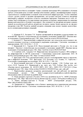 1. Абашкин В.Л., Богданов Т.В. Затраты организаций на внедрение и использование технологий ИИ / Институт статистических исследований и экономики знаний НИУ “Высшая школа экономики” [Электронный ресурс]. URL: https://issek.hse.ru/news/981416418.html.