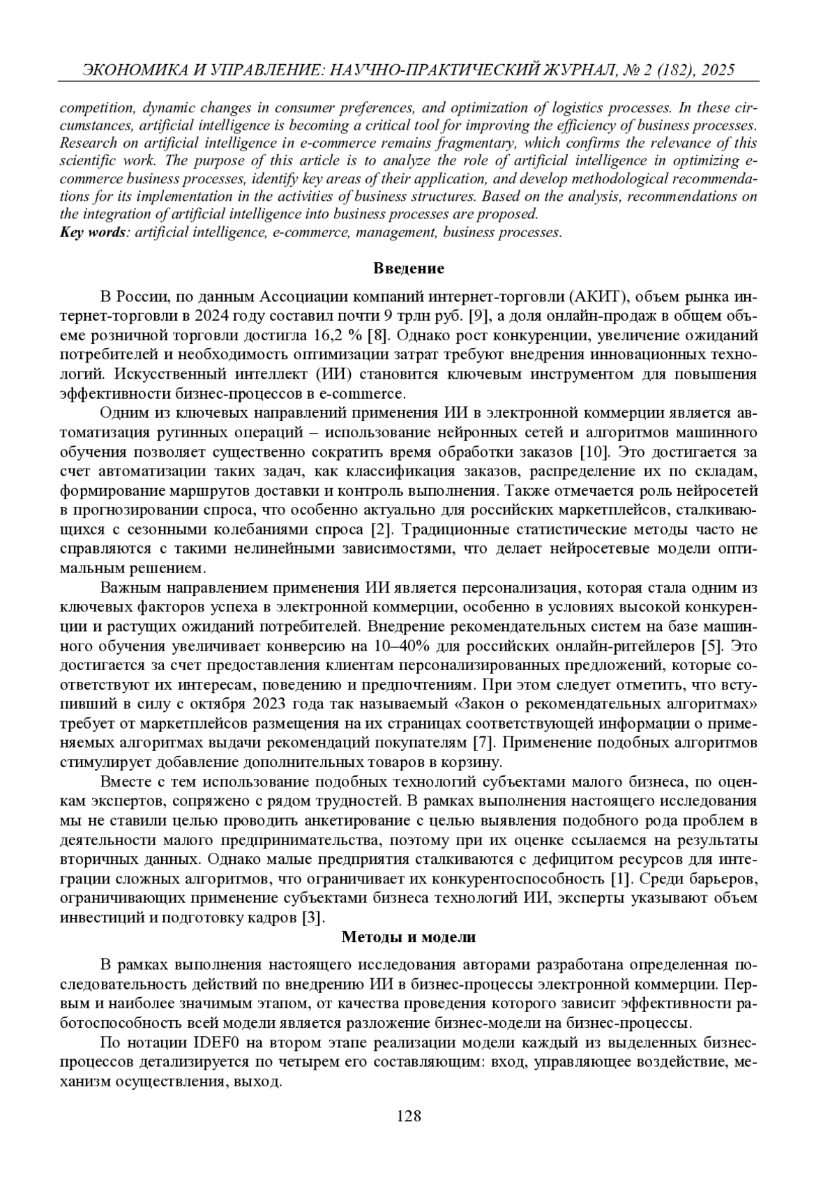 В России, по данным Ассоциации компаний интернет-торговли (АКИТ), объем рынка интернет-торговли в 2024 году составил почти 9 трлн руб. [9], а доля онлайн-продаж в общем объеме розничной торговли достигла 16,2 % [8]. Однако рост конкуренции, увеличение ожиданий потребителей и необходимость оптимизации затрат требуют внедрения инновационных технологий. Искусственный интеллект (ИИ) становится ключевым инструментом для повышения эффективности бизнес-процессов в e-commerce