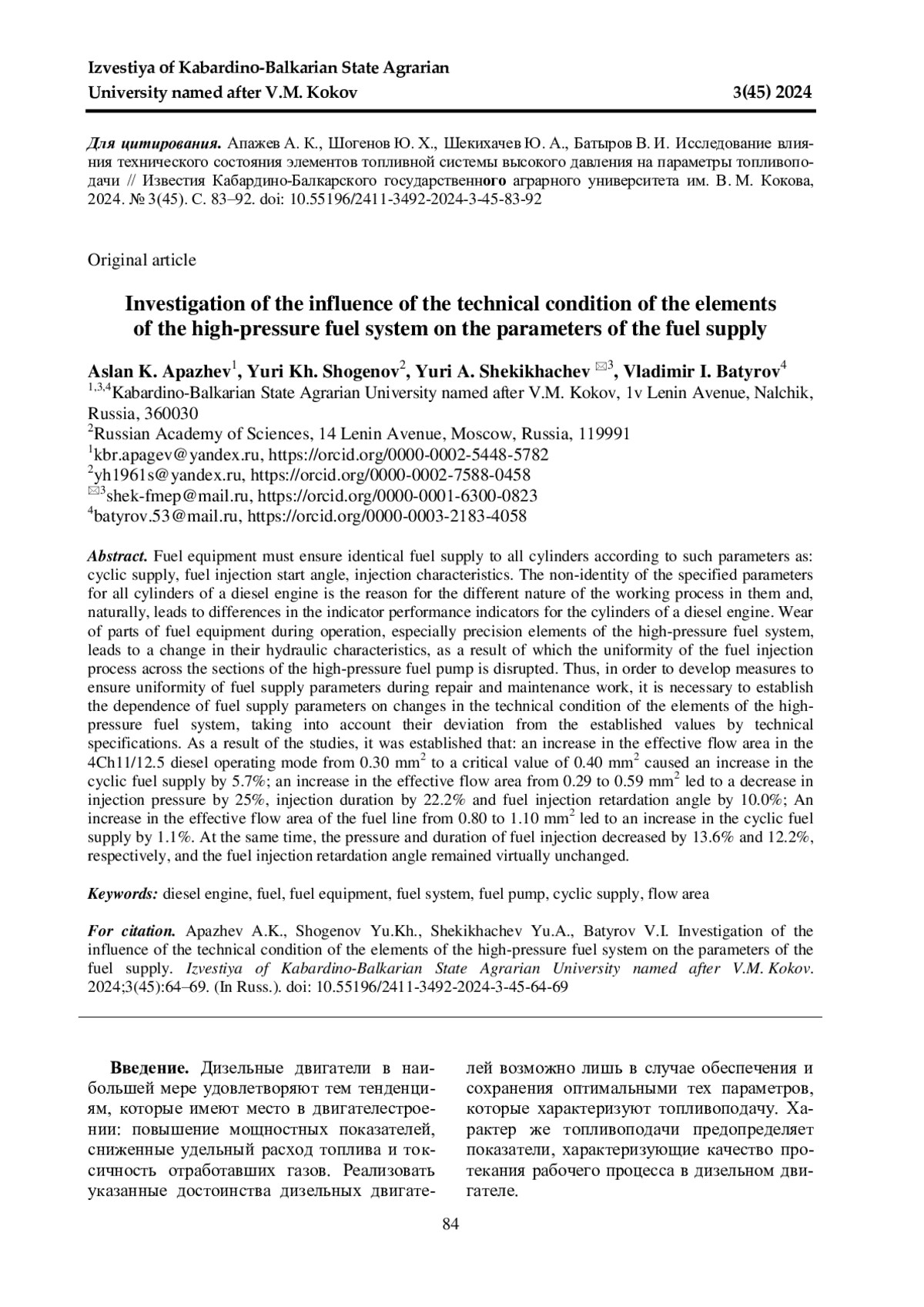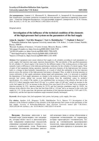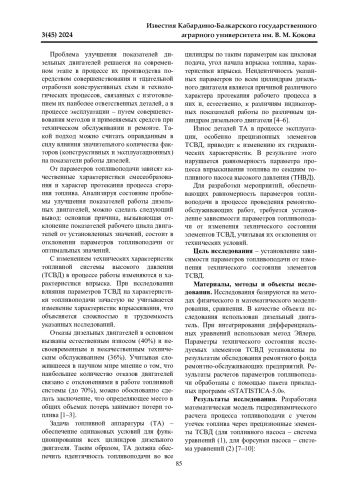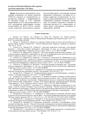 10. Батыров В. И., Койчев В. С., Болотоков А. Л. Зависимость параметров топливоподачи от давления в полости питания топливного насоса высокого давления // Научно-технический прогресс в АПК: проблемы и перспективы. Сборник трудов по материалам Международной научно-практической конференции, в рамках XVIII Международной агропромышленной выставки “Агроуниверсал - 2016”. Ставрополь: Изд-во “Агрус”, 2016. С. 252-256. EDN: WBHSPV