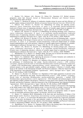 9. Батыров В. И., Койчев В. С., Болотоков А. Л. Влияние состояния топливной системы низкого давления на работоспособность топливных насосов распределительного типа // Научно-технический прогресс в АПК: проблемы и перспективы. Сборник научных трудов по материалам Международной научно-практической конференции, в рамках XVIII Международной агропромышленной выставки “Агроуниверсал - 2016”. Ставрополь: Изд-во “Агрус”, 2016. С. 247-252. EDN: WAWRAN