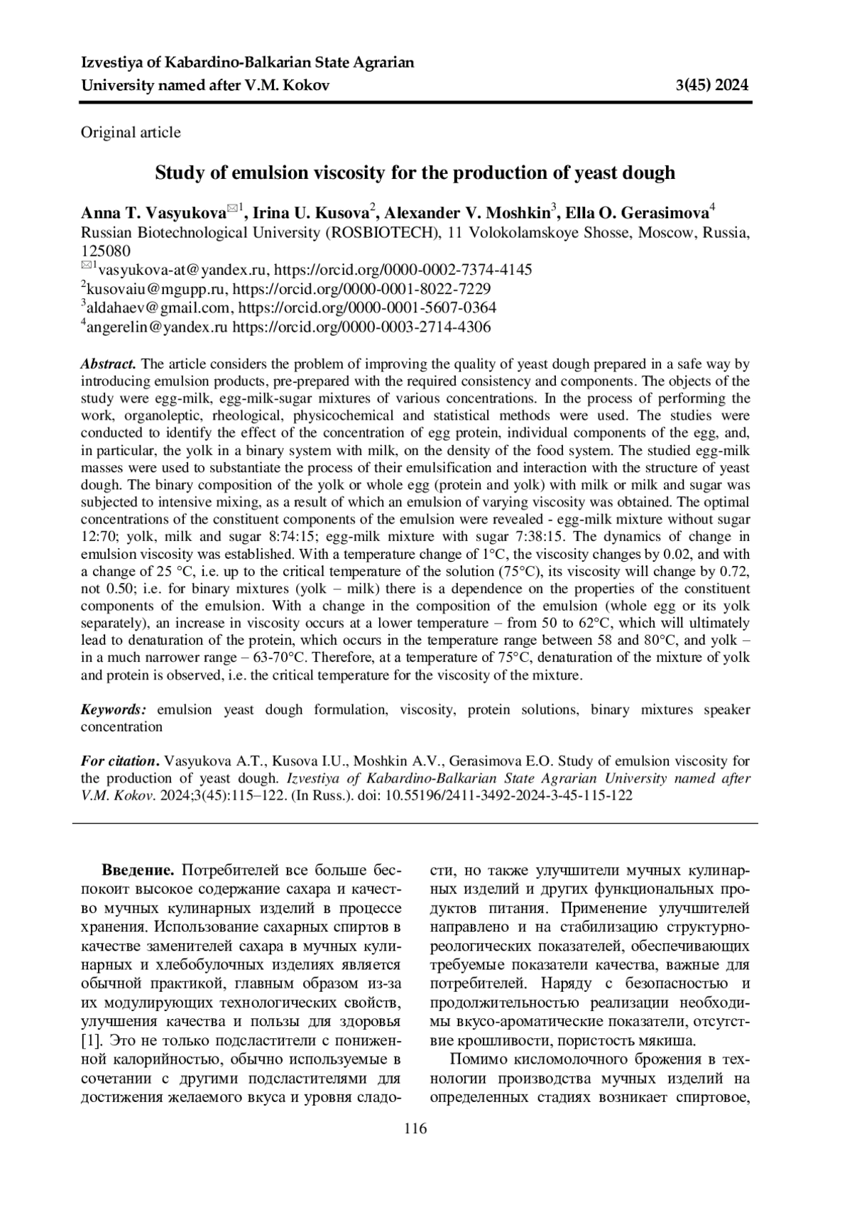 ВАСЮКОВА А. Т., КУСОВА И. У., МОШКИН А. В., ГЕРАСИМОВА Э. О. ИССЛЕДОВАНИЕ ВЯЗКОСТИ ЭМУЛЬСИИ ДЛЯ ПРОИЗВОДСТВА ДРОЖЖЕВОГО ТЕСТА // ИЗВЕСТИЯ КАБАРДИНО-БАЛКАРСКОГО ГОСУДАРСТВЕННОГО АГРАРНОГО УНИВЕРСИТЕТА ИМ. В. М. КОКОВА. 2024. № 3 (45)