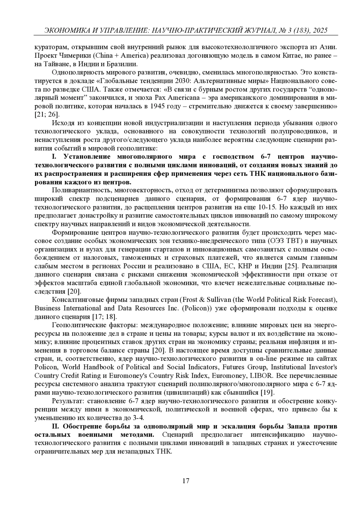 АХМЕТОВ Т. Р. СЦЕНАРИИ РАЗВИТИЯ НАУЧНО-ТЕХНОЛОГИЧЕСКОЙ ПОЛИТИКИ СТАРОПРОМЫШЛЕННЫХ РЕГИОНОВ В НОВЫХ ГЕОПОЛИТИЧЕСКИХ РЕАЛИЯХ // ЭКОНОМИКА И УПРАВЛЕНИЕ: НАУЧНО-ПРАКТИЧЕСКИЙ ЖУРНАЛ. 2025. № 3 (183)