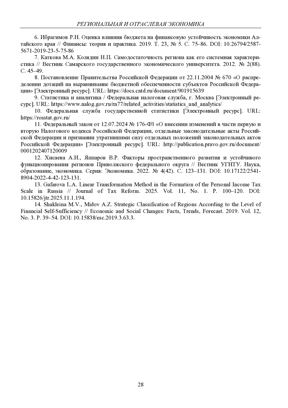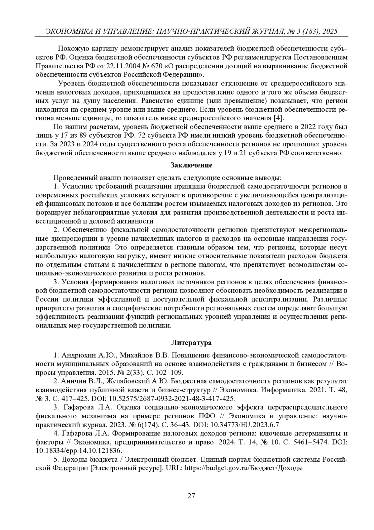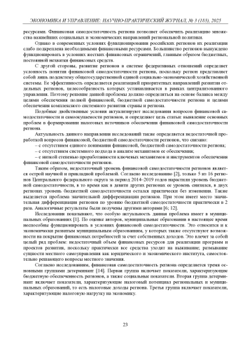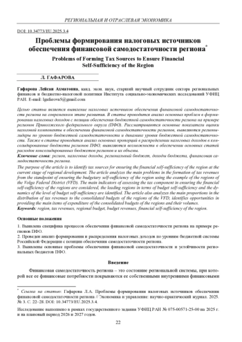 ГАФАРОВА Л. А. ПРОБЛЕМЫ ФОРМИРОВАНИЯ НАЛОГОВЫХ ИСТОЧНИКОВ ОБЕСПЕЧЕНИЯ ФИНАНСОВОЙ САМОДОСТАТОЧНОСТИ РЕГИОНА // ЭКОНОМИКА И УПРАВЛЕНИЕ: НАУЧНО-ПРАКТИЧЕСКИЙ ЖУРНАЛ. 2025. № 3 (183)