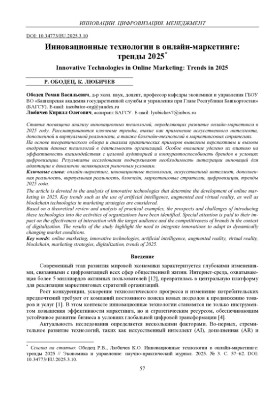 ОБОДЕЦ Р. В., ЛЮБИЧЕВ К. О. ИННОВАЦИОННЫЕ ТЕХНОЛОГИИ В ОНЛАЙН-МАРКЕТИНГЕ: ТРЕНДЫ 2025 // ЭКОНОМИКА И УПРАВЛЕНИЕ: НАУЧНО-ПРАКТИЧЕСКИЙ ЖУРНАЛ. 2025. № 3 (183)