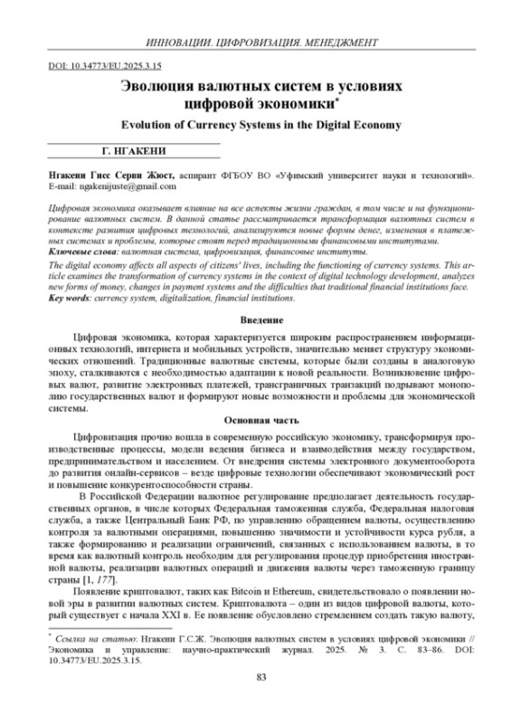 НГАКЕНИ Г. С. ЭВОЛЮЦИЯ ВАЛЮТНЫХ СИСТЕМ В УСЛОВИЯХ ЦИФРОВОЙ ЭКОНОМИКИ // ЭКОНОМИКА И УПРАВЛЕНИЕ: НАУЧНО-ПРАКТИЧЕСКИЙ ЖУРНАЛ. 2025. № 3 (183)