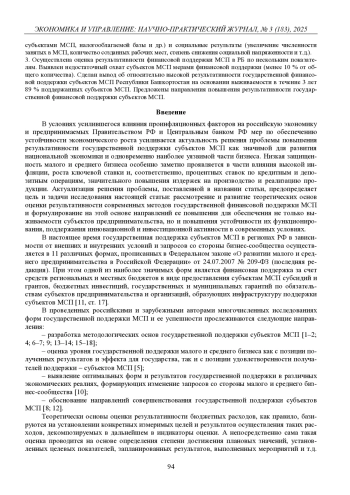 В условиях усилившегося влияния проинфляционных факторов на российскую экономику и предпринимаемых Правительством РФ и Центральным банком РФ мер по обеспечению устойчивости экономического роста усиливается актуальность решения проблемы повышения результативности государственной поддержки субъектов МСП как значимой для развития национальной экономики и одновременно наиболее уязвимой части бизнеса. Низкая защищенность малого и среднего бизнеса особенно заметно проявляется в части влияния высокой инфляции, роста ключевой ставки и, соответственно, процентных ставок по кредитным и депозитным операциям, значительного повышения издержек на производство и реализацию продукции. Актуализация решения проблемы, поставленной в названии статьи, предопределяет цель и задачи исследования настоящей статьи: рассмотрение и развитие теоретических основ оценки результативности современных методов государственной финансовой поддержки МСП и формулирование на этой основе направлений ее повышения для обеспечения не только выживаемости субъектов предпринимательства, но и повышения устойчивости их функционирования, поддержания инновационной и инвестиционной активности в современных условиях