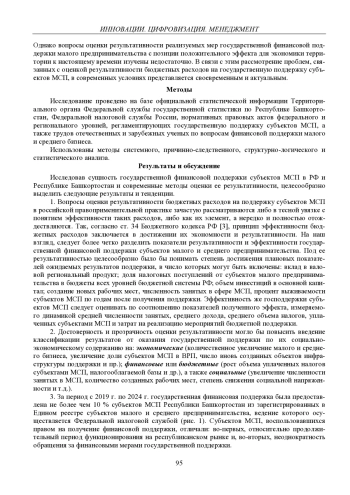В статье проведено исследование теоретических основ современных методов государственной финансовой поддержки субъектов малого и среднего предпринимательства (далее – МСП) и оценки ее результативности в разрезе субъектов РФ. Выявлено некоторое смешение категорий результативности и эффективности расходов на поддержку МСП. Предложено авторское определение результативности расходов на поддержку МСП, система показателей для их оценки и направления их повышения. Полученные результаты могут быть использованы органами управления Республики Башкортостан для совершенствования финансовой поддержки субъектов МСП в части повышения ее результативности