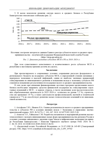 1. Алтуфьева Т.Ю., Иванов П.А. Оценка резилиентности малого и среднего предпринимательства в субъектах РФ в условиях внешних шоков // Экономика и управление: научно-практический журнал. 2023. № 5(173). С. 101-107. DOI: 10.34773/EU.2023.5.18
