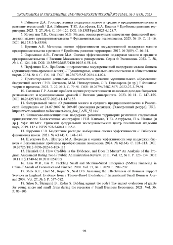 4. Гайнанов Д.А. Государственная поддержка малого и среднего предпринимательства и развитие территорий / Д.А. Гайнанов, Т.Ю. Алтуфьева, П.А. Иванов // Проблемы развития территории. 2023. Т. 27, № 6. С. 104-120. DOI: 10.15838/ptd.2023.6.128.7 EDN: BCENHG