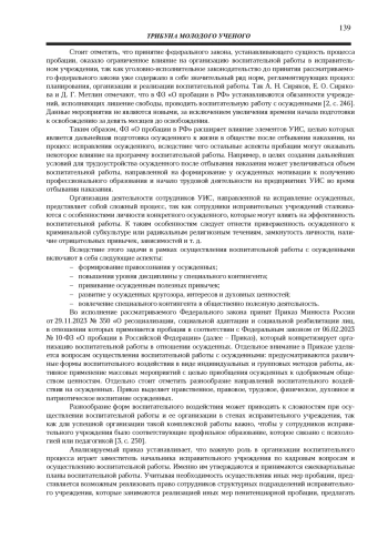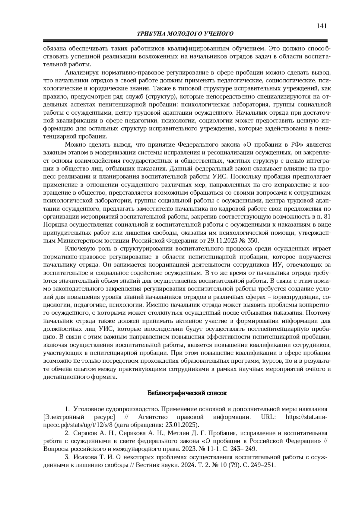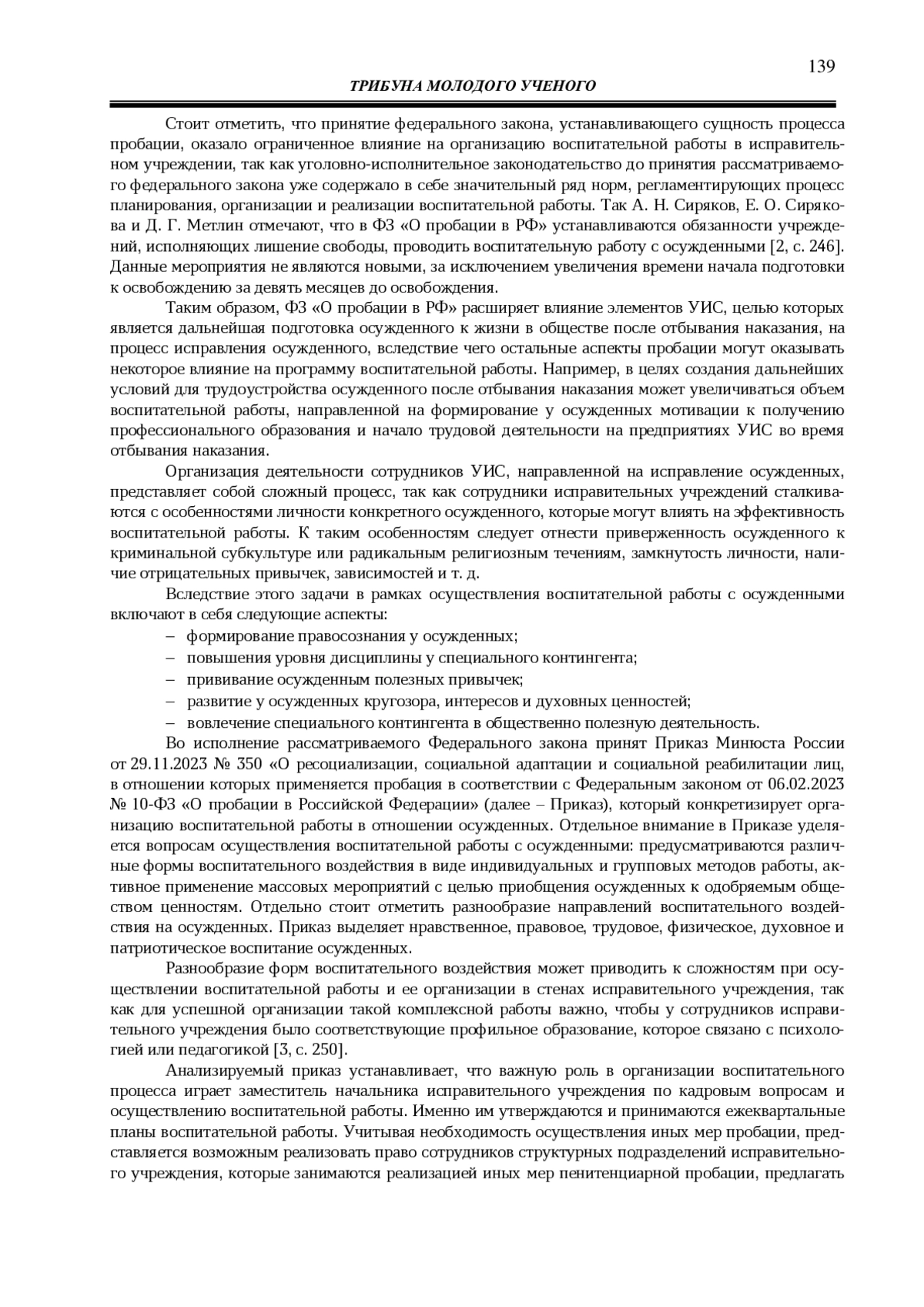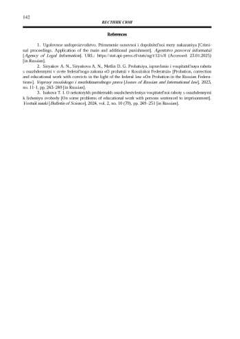 2. Сиряков А. Н., Сирякова А. Н., Метлин Д. Г. Пробация, исправление и воспитательная работа с осужденными в свете федерального закона “О пробации в Российской Федерации” // Вопросы российского и международного права. 2023. № 11-1. С. 243- 249. EDN: PSPERV
