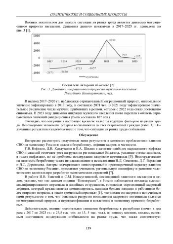Проведено исследование эффекта влияния специальной военной операции на динамику кадрового потенциала республики. Статья подготовлена на основе данных Башкортостанстата: численность ITспециалистов, уровень среднемесячной начисленной заработной платы их труда, численность трудоспособного населения, миграционный прирост мужского населения РБ и численность безработных за период 2017–2023 гг. Проведен расчет абсолютных и относительных показателей, выполнен корреляционный анализ. Получены выводы о несостоятельности утверждения о наличии острого кадрового дефицита, об устойчивости рынка труда. При этом с помощью теста Чоу выявлено наличие структурных изменений для временного ряда численности безработных. Зафиксировано снижение уровня общей безработицы с 2017 по 2023 г. почти в два раза, что послужило источником поддержания предложения на рынке трудовых ресурсов республики
