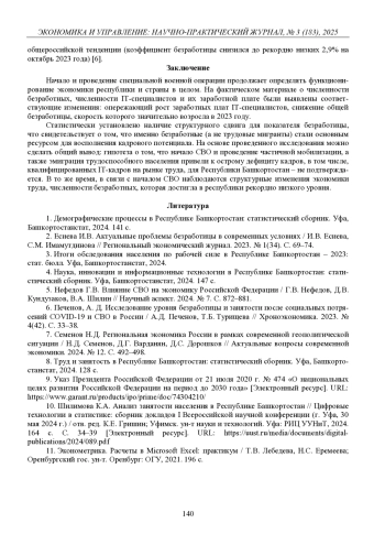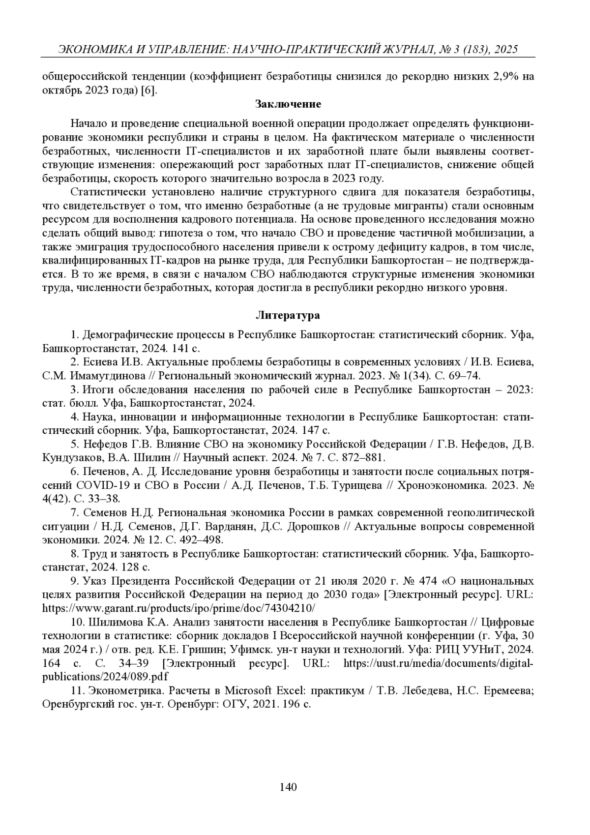 ПРУДНИКОВ В. Б., ШИЛИМОВА К. А. СПЕЦИАЛЬНАЯ ВОЕННАЯ ОПЕРАЦИЯ И КАДРОВЫЙ РЫНОК IT-СПЕЦИАЛИСТОВ РЕСПУБЛИКИ БАШКОРТОСТАН // ЭКОНОМИКА И УПРАВЛЕНИЕ: НАУЧНО-ПРАКТИЧЕСКИЙ ЖУРНАЛ. 2025. № 3 (183)