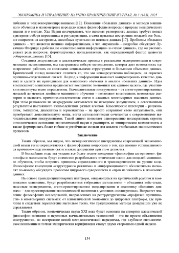 В статье прослеживается эволюция философских основ экономической методологии – от синкретического мышления представителей древних обществ до современных вычислительных и экспериментальных приемов. На примере Бэкона и Декарта показано, как индукция и дедукция формировали научный метод Нового времени, а Аристотель и Юм заложили основы понятий дедукции и индукции. Рассматриваются диалектика Гегеля, «понимающее объяснение» Вебера, институциональный подход Норта и Остром, а также некоторые аспекты феноменологического и герменевтического анализа. Внимание уделено поведенческой экономике, методам анализа «больших данных», их философским основаниям и перспективам интеграции классических категорий с современными технологиями