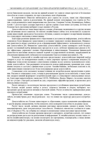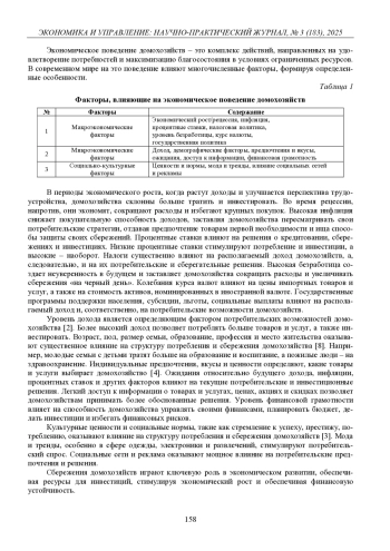 ХАСАНШИНА А. А. ФАКТОРЫ И ОСОБЕННОСТИ СОВРЕМЕННОГО ЭКОНОМИЧЕСКОГО ПОВЕДЕНИЯ ДОМОХОЗЯЙСТВ // ЭКОНОМИКА И УПРАВЛЕНИЕ: НАУЧНО-ПРАКТИЧЕСКИЙ ЖУРНАЛ. 2025. № 3 (183)