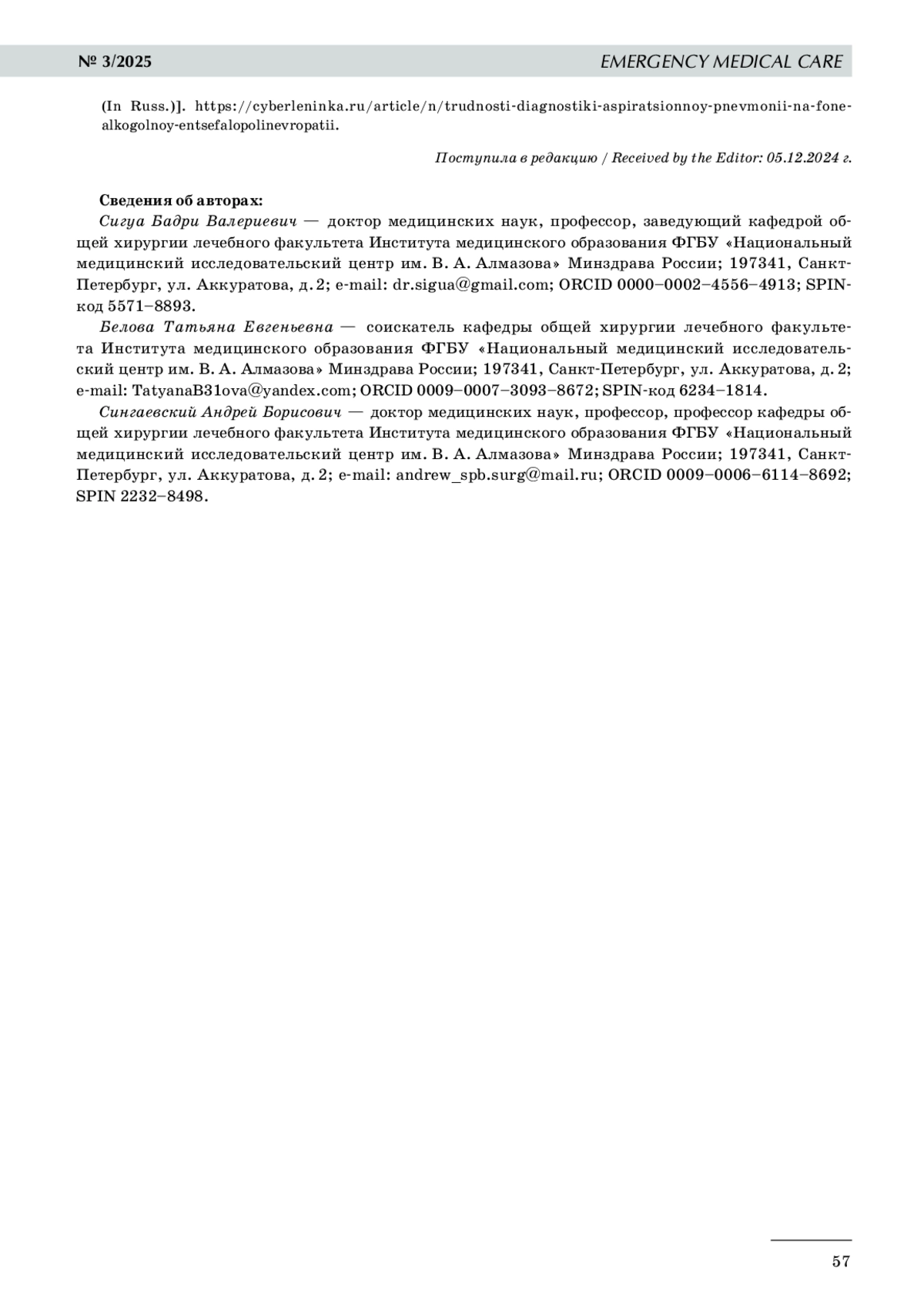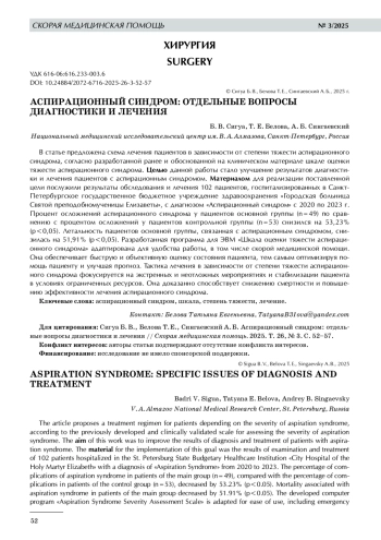 1. Сигуа Б. В., Белова Т. Е., Бурлаченко Е. П., Земляной В. П. Рентгенэндоскопическая классификация аспирационного синдрома // Эндоскопическая хирургия. 2025. Т. 31, № 1. С. 31-37.
