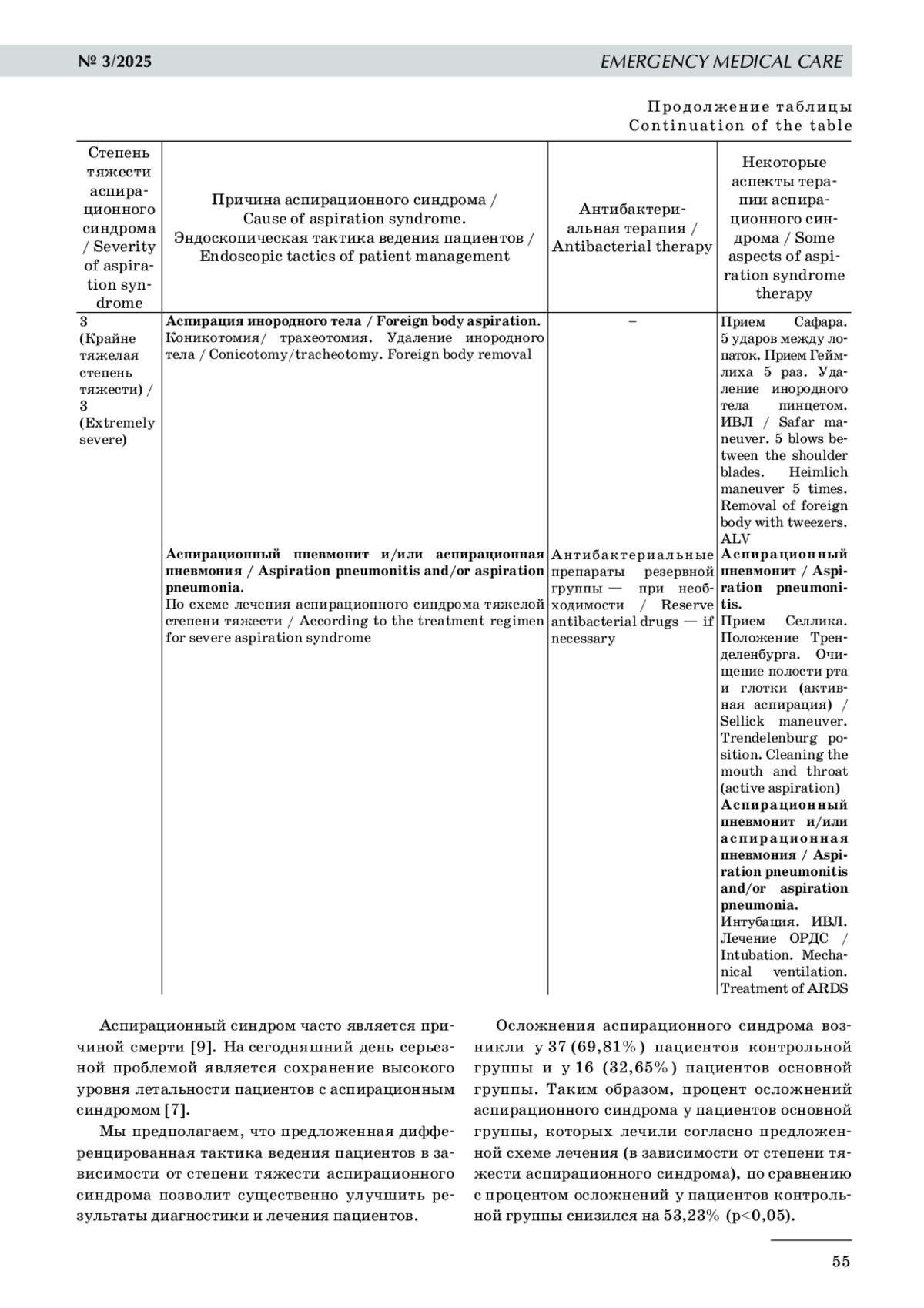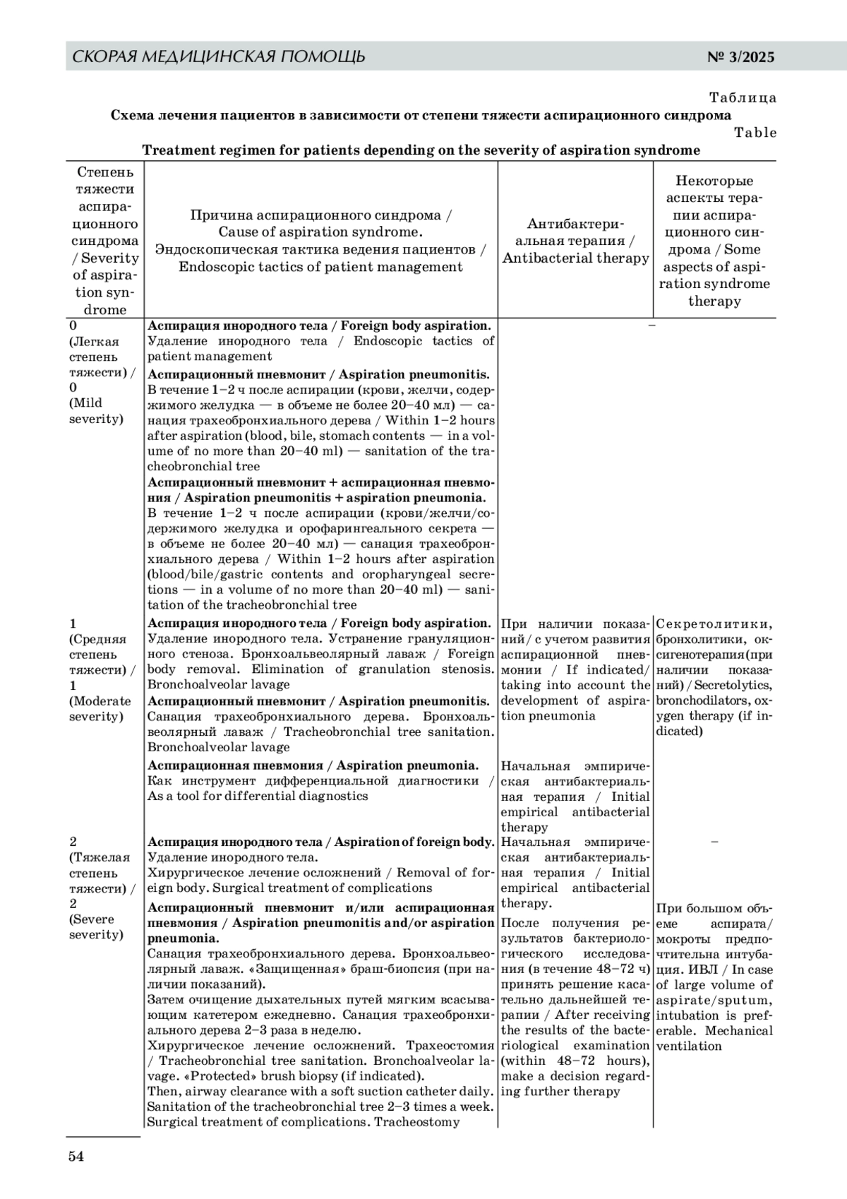 В статье предложена схема лечения пациентов в зависимости от степени тяжести аспирационного синдрома, согласно разработанной ранее и обоснованной на клиническом материале шкале оценки тяжести аспирационного синдрома. Целью данной работы стало улучшение результатов диагностики и лечения пациентов с аспирационным синдромом. Материалом для реализации поставленной цели послужили результаты обследования и лечения 102 пациентов, госпитализированных в СанктПетербургское государственное бюджетное учреждение здравоохранения «Городская больница Святой преподобномученицы Елизаветы», с диагнозом «Аспирационный синдром» с 2020 по 2023 г. Процент осложнений аспирационного синдрома у пациентов основной группы (n=49) по сравнению с процентом осложнений у пациентов контрольной группы (n=53) снизился на 53,23% (р<0,05). Летальность пациентов основной группы, связанная с аспирационным синдромом, снизилась на 51,91% (р<0,05). Разработанная программа для ЭВМ «Шкала оценки тяжести аспирационного синдрома» адаптирована для удобства работы, в том числе скорой медицинской помощи. Она обеспечивает быструю и объективную оценку состояния пациента, тем самым оптимизируя помощь пациенту и улучшая прогноз. Тактика лечения в зависимости от степени тяжести аспирационного синдрома фокусируется на экстренных и неотложных мероприятиях и стабилизации пациента в условиях ограниченных ресурсов. Она доказанно способствует снижению смертности и повышению эффективности лечения аспирационного синдрома.