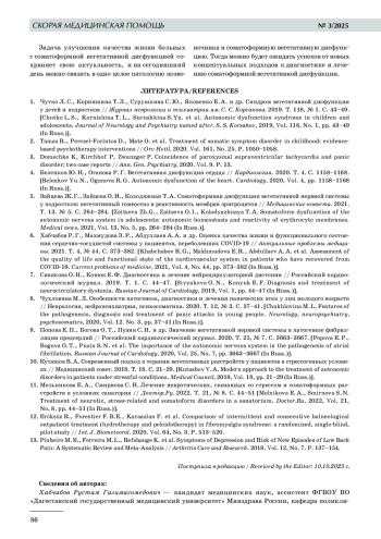 1. Чутко Л. С., Корнишина Т. Л., Сурушкина С. Ю., Яковенко Е. А. и др. Синдром вегетативной дисфункции у детей и подростков // Журнал неврологии и психиатрии им. С. С. Корсакова. 2019. Т. 118, № 1. С. 43-49.