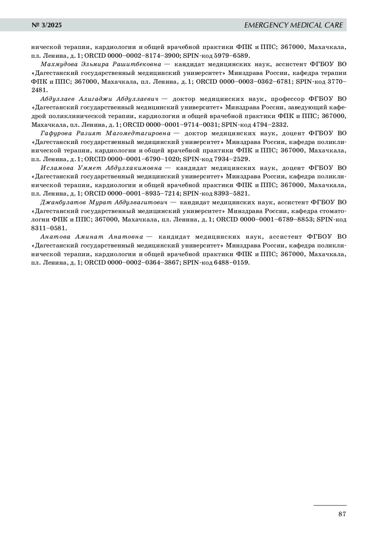 6. Хабчабов Р. Г., Махмудова Э. Р., Абдуллаев А. А. и др. Оценка качества жизни и функционального состояния сердечно-сосудистой системы у пациентов, переболевших COVID-19 // Актуальные проблемы медицины. 2021. Т. 4, № 44. С. 373-382.