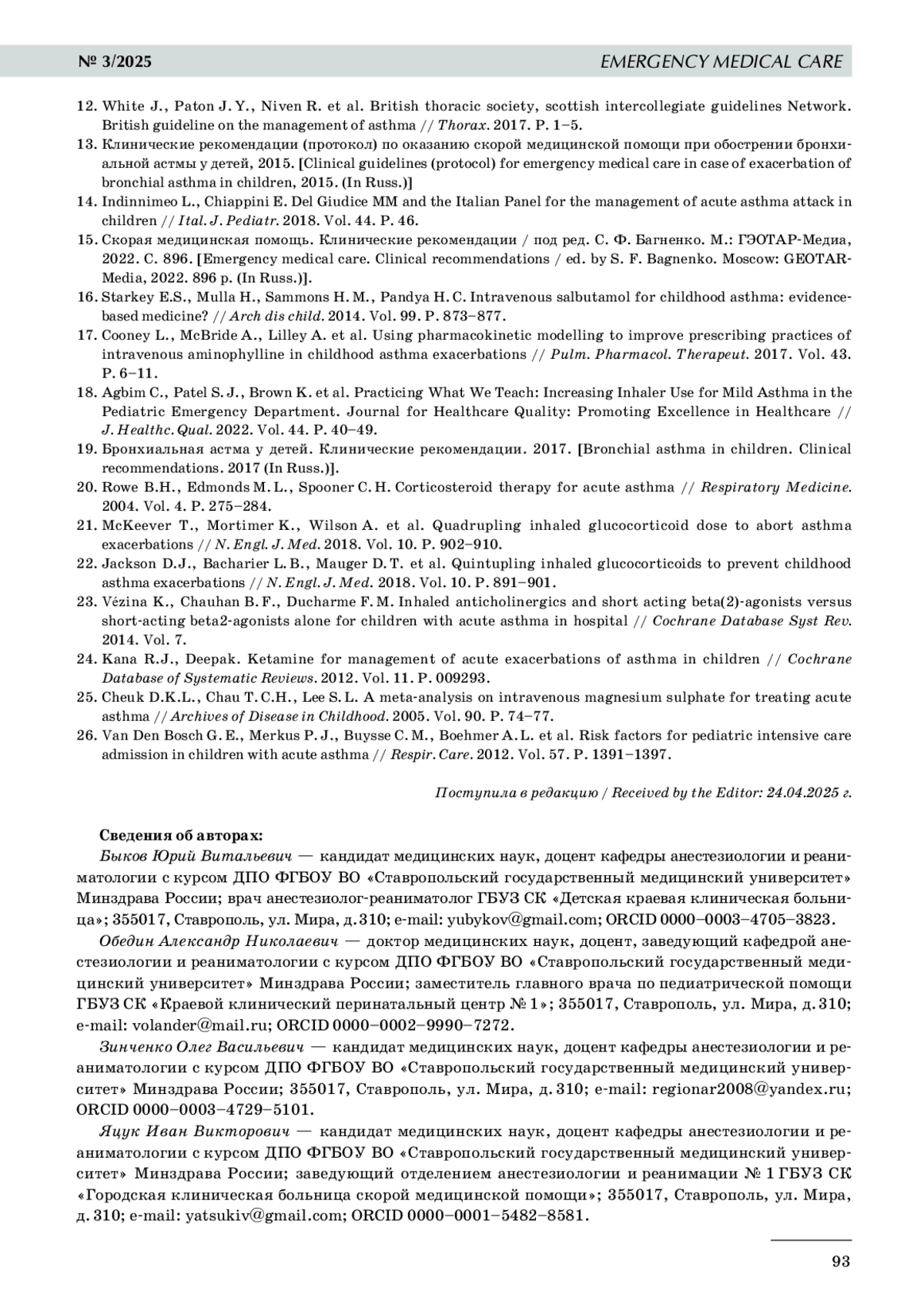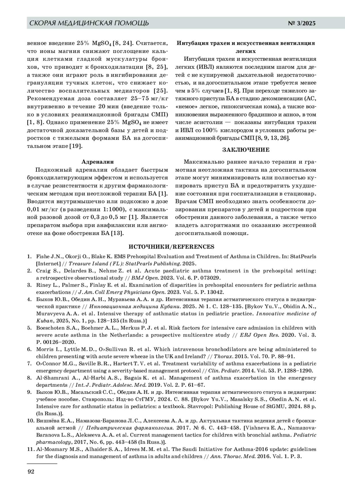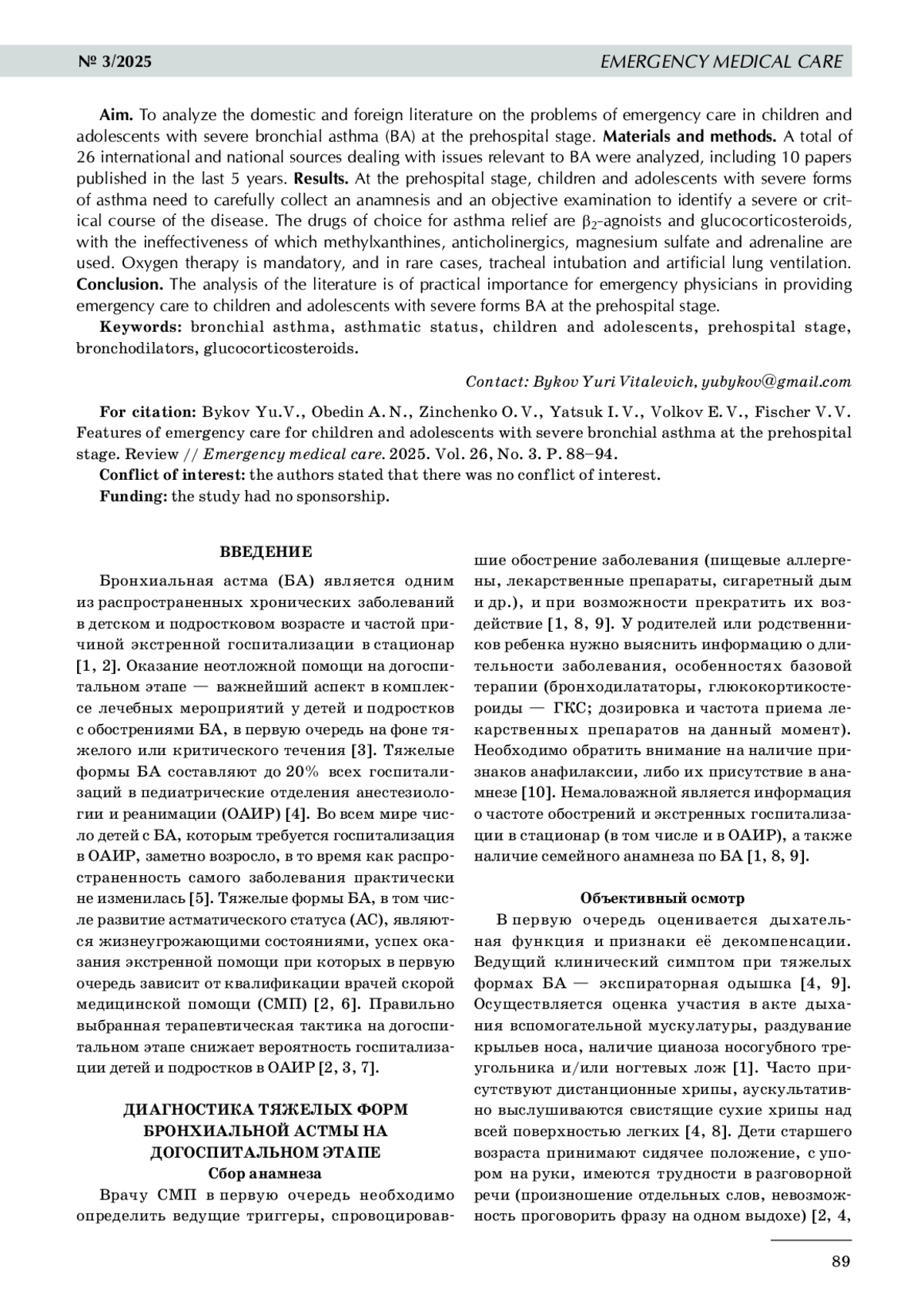БЫКОВ Ю. В., ОБЕДИН А. Н., ЗИНЧЕНКО О. В., ЯЦУК И. В., ВОЛКОВ Е. В., ФИШЕР В. В. ОСОБЕННОСТИ ОКАЗАНИЯ НЕОТЛОЖНОЙ ПОМОЩИ ДЕТЯМ И ПОДРОСТКАМ С ТЯЖЕЛЫМ ТЕЧЕНИЕМ БРОНХИАЛЬНОЙ АСТМЫ НА ДОГОСПИТАЛЬНОМ ЭТАПЕ. ОБЗОР // СКОРАЯ МЕДИЦИНСКАЯ ПОМОЩЬ. 2025. № 3, ТОМ 26