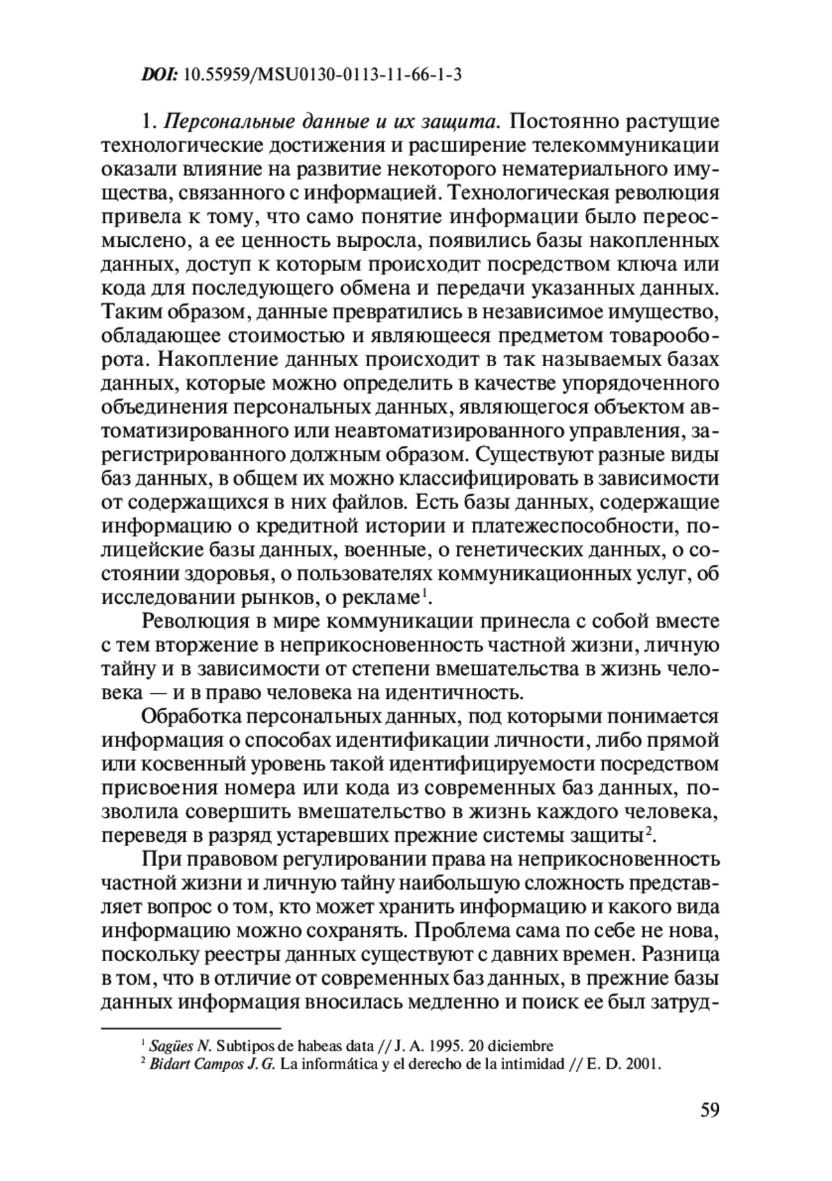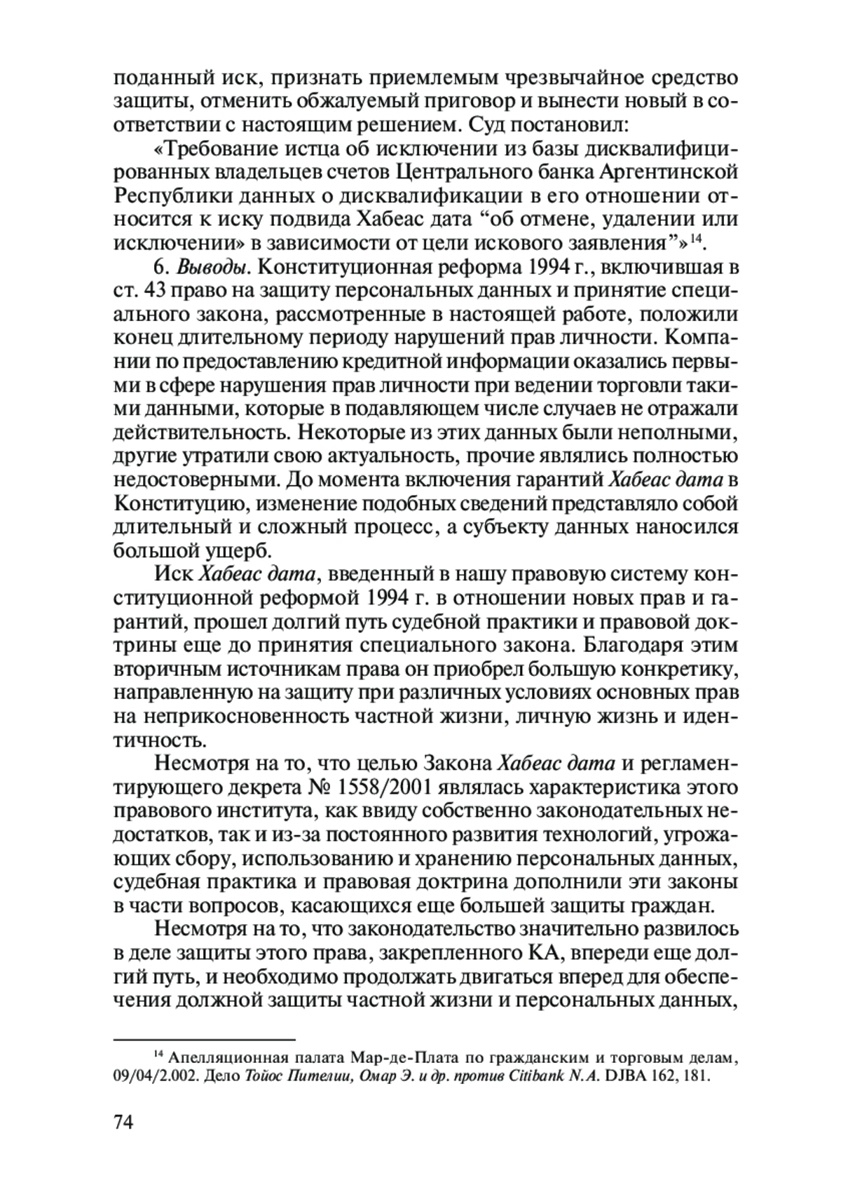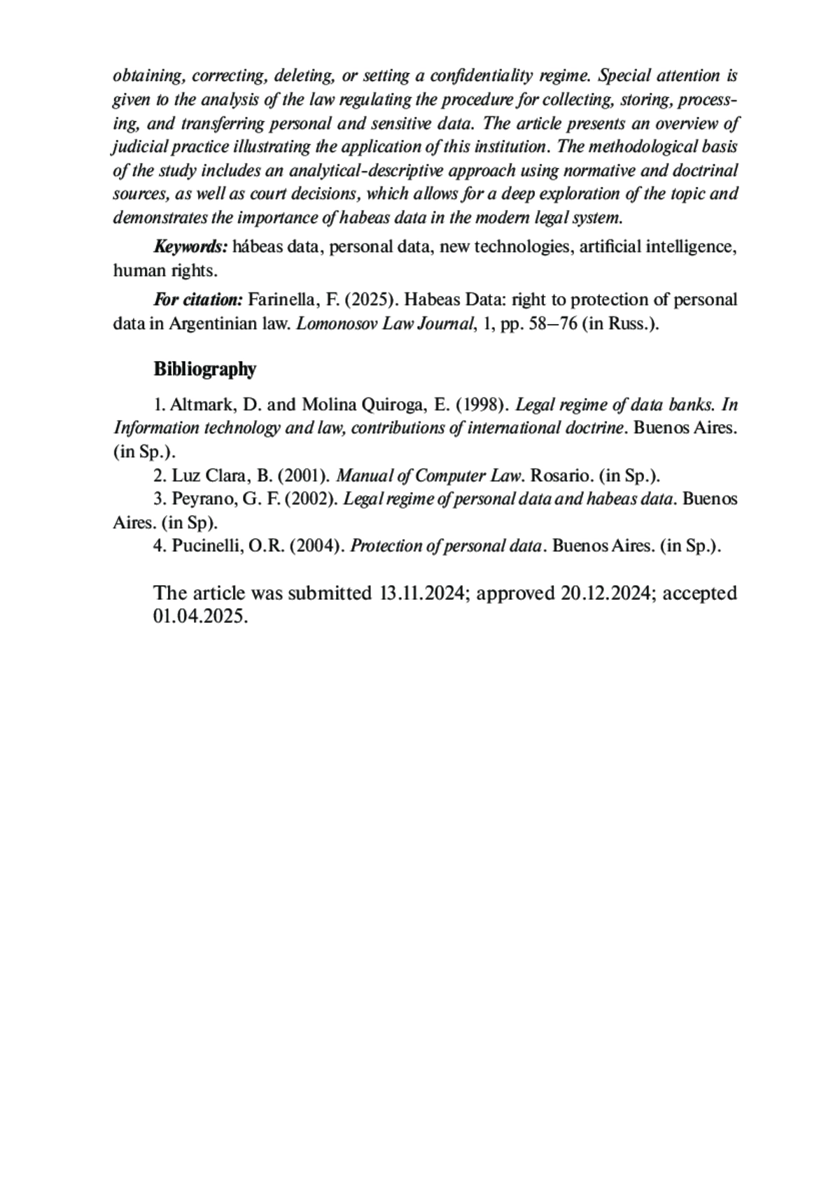 Технологическая революция привела к переосмыслению роли инфор мации и персональных данных, которые ныне рассматриваются как самостоятельный объект гражданских прав, обладающий экономической ценностью и активно вовлеченный в гражданский оборот. Такое положение вещей порождает новые риски и угрозы для основных прав человека, включая право на неприкосновенность частной жизни, защиту личной тайны и сохранение идентичности. В связи с этим возникает необходимость в эффективных правовых механизмах, обеспечивающих защиту указанных прав в условиях стремительного технологического развития. В статье подробно рассматривается институт Хабеас дата, закрепленный в Конституции Аргентины, обеспечивающий оперативную и доступную судебную защиту персональных данных, включая возможность их получения, исправления, удаления или установления режима конфиденциальности. Особое внимание уделено анализу закона, регулирующего порядок сбора, хранения, обработки и передачи персональной информации, а также чувствительных данных. Представлен обзор судебной практики, иллюстрирующей применение данного института. Методологическая основа исследования включает аналитико-описательный подход с использованием нормативных и доктринальных источников, а также решений судов, что позволяет глубоко раскрыть затронутую проблематику и продемонстрировать значимость Хабеас дата в современной правовой системе.