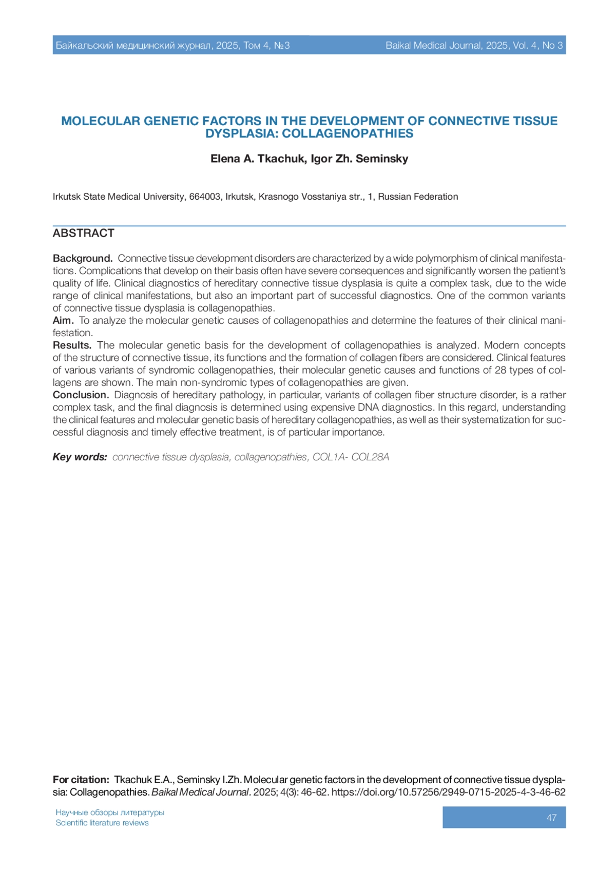 Понятие «дисплазии соединительной ткани» (ДСТ) объединяет достаточно большое количество заболеваний, которые можно встретить в любом возрасте. Клинические проявления ДСТ отличаются широким полиморфизмом [1] и часто игнорируются врачами. Однако осложнения, которые развиваются на их основе, имеют тяжёлые последствия и значительно ухудшают качество жизни пациента. ДСТ представлены несколькими типами нарушений, среди них самыми распространёнными являются коллагенопатии. В связи с этим понимание роли ДСТ в развитии патологических состояний и её молекулярно-генетическая диагностика может иметь решающее значение для назначения эффективного лечения и профилактики осложнений.
