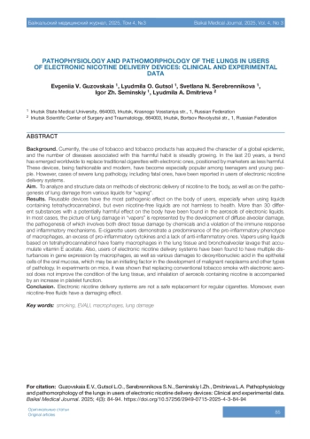 Результаты. Наиболее патогенным действием на организм пользователей обладают многоразовые устройства, особенно при использовании жидкостей, содержащих тетрагидроканнабинол, но даже безникотиновые составы не являются безвредными для здоровья. В аэрозолях электронных жидкостей найдены более 30 различных веществ с потенциально вредным действием на организм. В большинстве случаев картина повреждения лёгких у «вейперов» представлена развитием диффузного альвеолярного повреждения, в патогенезе которого участвуют как прямое повреждение ткани химическими веществами, так и нарушение иммунного ответа и механизмов воспаления. Пользователи электронных сигарет демонстрируют преобладание провоспалительного фенотипа макрофагов, избыток провоспалительных цитокинов и недостаток противовоспалительных. У вейперов, использующих жидкости на основе тетрагидроканнабинола, в тканях лёгких и бронхоальвеолярном лаваже обнаруживаются пенистые макрофаги, накапливающие ацетат витамина Е. Также у пользователей электронных средств доставки никотина были выявлены множественные нарушения экспрессии генов макрофагами, а также различные повреждения дезоксирибонуклеиновой кислоты в клетках эпителия слизистой оболочки полости рта, что может являться инициирующим фактором в развитии злокачественных новообразований и других видов патологии. В экспериментах на мышах было показано, что замена обычного табачного дыма на электронный аэрозоль не улучшает состояние лёгочной ткани, а ингаляция аэрозолей, содержащих никотин, сопровождается повышением функций тромбоцитов.