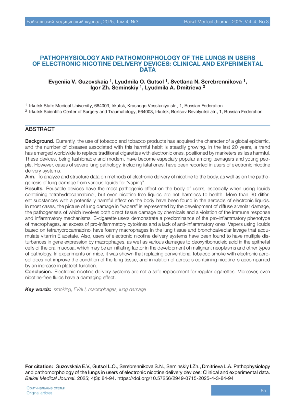 Актуальность. В настоящее время употребление табака и табачных изделий приобрело характер мировой эпидемии, а количество ассоциированных с этой вредной привычкой заболеваний неуклонно растёт. В последние 20 лет во всём мире появилась тенденция замены традиционных сигарет на электронные, позиционируемые маркетологами как менее вредные. Эти устройства, будучи модными и современными, стали особенно популярными у подростков и молодёжи. Тем не менее, у пользователей электронных систем доставки никотина были зарегистрированы случаи тяжёлой патологии лёгких, в том числе с летальным исходом.