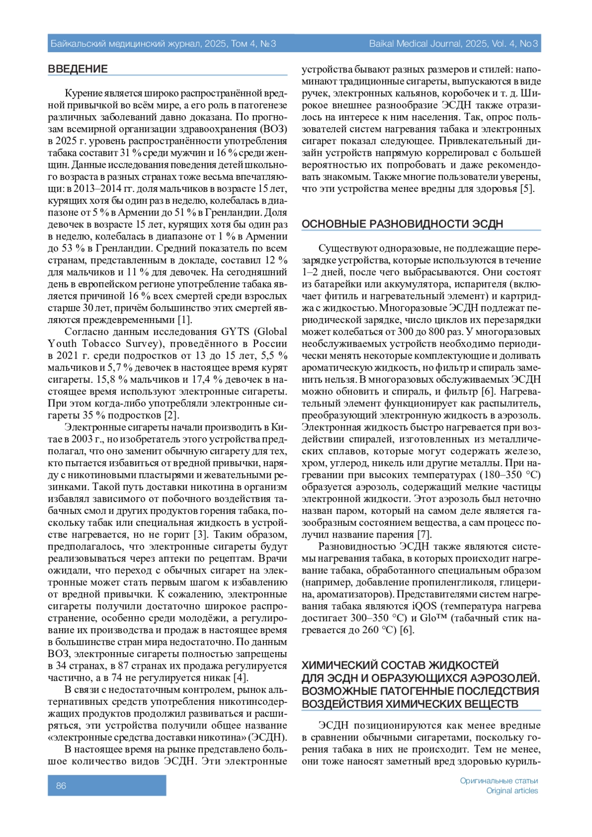 6. Ткаченко А.В., Слинькова Т.А., Шипкова Л.Н. Новый тренд: электронные системы доставки никотина. Медико-фармацевтический журнал “Пульс”. 2023;25(4):102-107. DOI: 10.26787/nydha-2686-6838-2023-25-4