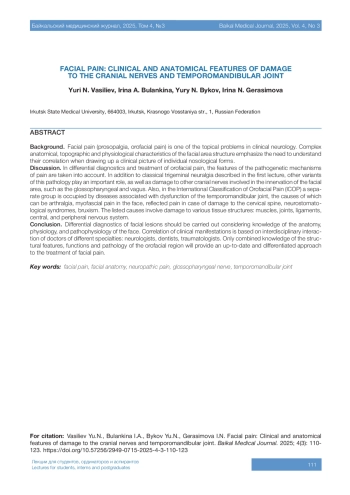 Заключение. Дифференциальная диагностика поражения лицевой области должна проводиться с учётом знания анатомии, физиологии, патофизиологии лица. Корреляция клинических проявлений основана на междисциплинарном взаимодействии врачей разных специальностей: неврологов, стоматологов, травматологов. Только объединённые знания особенностей строения, функций и патологии орофациальной области позволят обеспечить актуальный и дифференцированный подход к терапии лицевых болей.