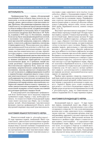 4. Барабанова Э.В., Барановский А.Е., Сытый Ю.В. Невралгия языкоглоточного нерва: семиотика, диагностика, лечение, клинические наблюдения. Медицинские новости. 2018;11(290):19-24. URL: https://www.mednovosti.by/journal.aspx?id=394.