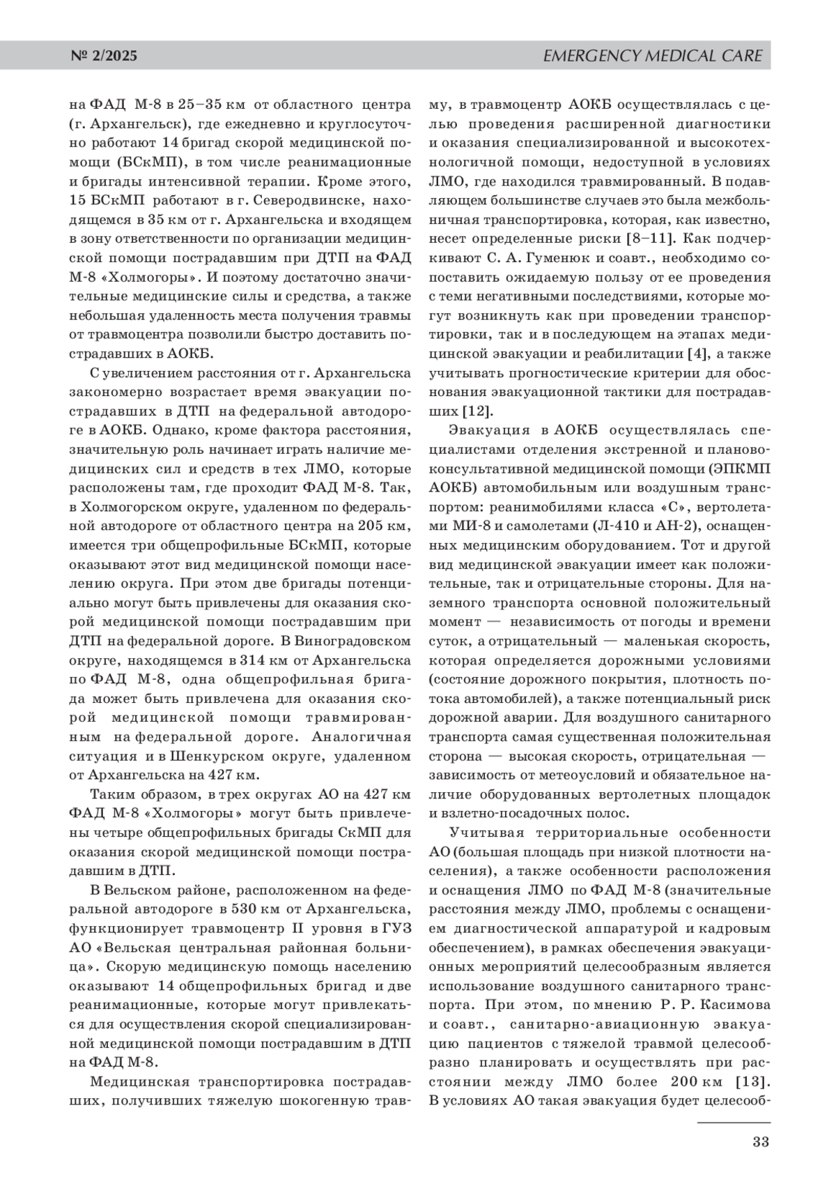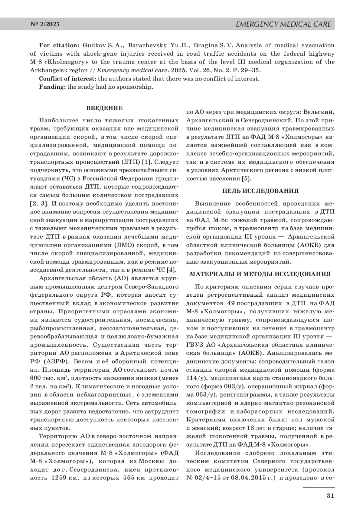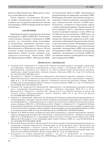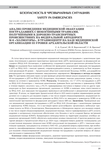 5. Баранов А. В. Межбольничная медицинская эвакуация пострадавших в дорожно-транспортных происшествиях на федеральной автодороге М-8 “Холмогоры” в Архангельской области // Медицина катастроф. 2020. № 4. С. 66-69.