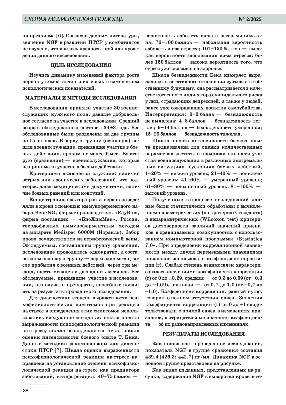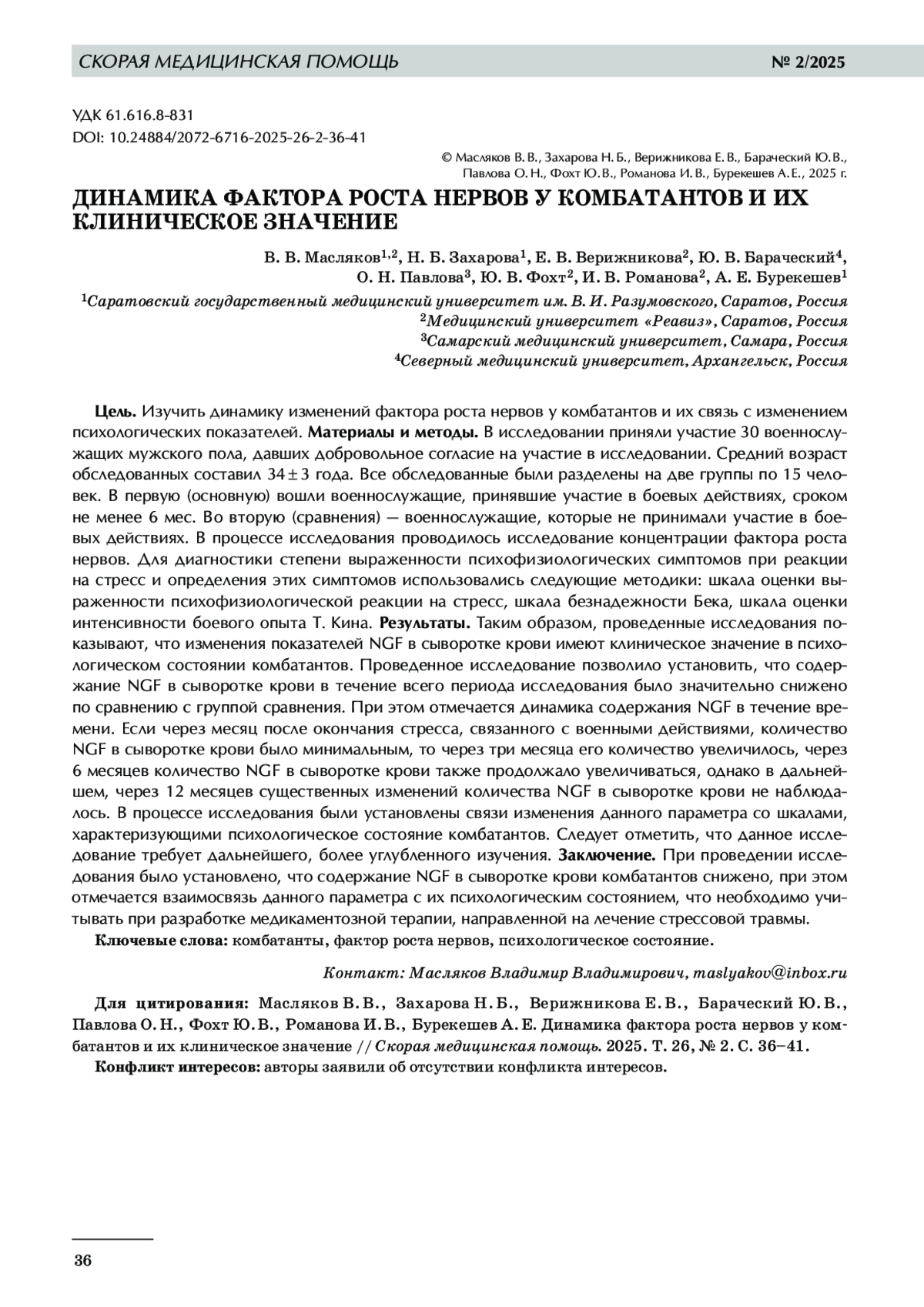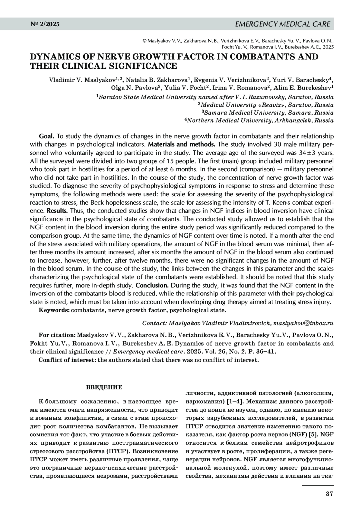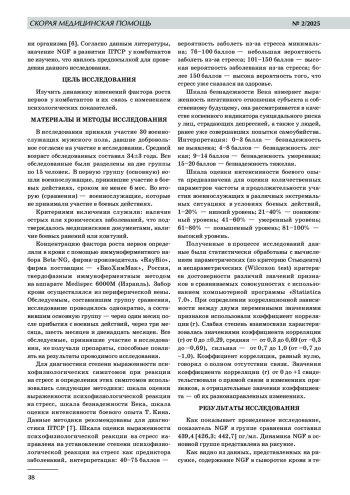 Цель. Изучить динамику изменений фактора роста нервов у комбатантов и их связь с изменением психологических показателей. Материалы и методы. В исследовании приняли участие 30 военнослужащих мужского пола, давших добровольное согласие на участие в исследовании. Средний возраст обследованных составил 34±3 года. Все обследованные были разделены на две группы по 15 человек. В первую (основную) вошли военнослужащие, принявшие участие в боевых действиях, сроком не менее 6 мес. Во вторую (сравнения) — военнослужащие, которые не принимали участие в боевых действиях. В процессе исследования проводилось исследование концентрации фактора роста нервов. Для диагностики степени выраженности психофизиологических симптомов при реакции на стресс и определения этих симптомов использовались следующие методики: шкала оценки выраженности психофизиологической реакции на стресс, шкала безнадежности Бека, шкала оценки интенсивности боевого опыта Т. Кина. Результаты. Таким образом, проведенные исследования показывают, что изменения показателей NGF в сыворотке крови имеют клиническое значение в психологическом состоянии комбатантов. Проведенное исследование позволило установить, что содержание NGF в сыворотке крови в течение всего периода исследования было значительно снижено по сравнению с группой сравнения. При этом отмечается динамика содержания NGF в течение времени. Если через месяц после окончания стресса, связанного с военными действиями, количество NGF в сыворотке крови было минимальным, то через три месяца его количество увеличилось, через 6 месяцев количество NGF в сыворотке крови также продолжало увеличиваться, однако в дальнейшем, через 12 месяцев существенных изменений количества NGF в сыворотке крови не наблюдалось. В процессе исследования были установлены связи изменения данного параметра со шкалами, характеризующими психологическое состояние комбатантов. Следует отметить, что данное исследование требует дальнейшего, более углубленного изучения. Заключение. При проведении исследования было установлено, что содержание NGF в сыворотке крови комбатантов снижено, при этом отмечается взаимосвязь данного параметра с их психологическим состоянием, что необходимо учитывать при разработке медикаментозной терапии, направленной на лечение стрессовой травмы.