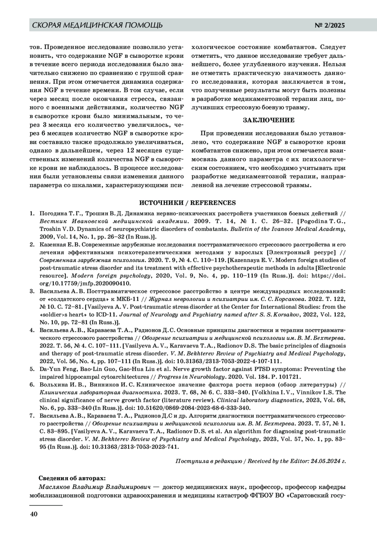 6. Вольхина И. В., Винников И. С. Клиническое значение фактора роста нервов (обзор литературы) // Клиническая лабораторная диагностика. 2023. Т. 68, № 6. С. 333-340.