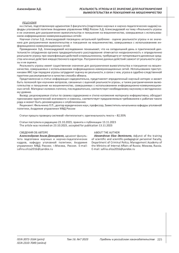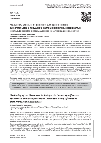 В статье рассматривается проблема - оценки реальности угрозы и ее значения для разграничения вымогательства и покушения на мошенничество, совершаемых с использованием информационно-коммуникационных сетей (далее - ИКС). Использование преступниками ИКС при передаче угрозы затрудняет оценку ее реальности, в связи с чем, в судебно-следственной практике возникают трудности при квалификации. Цель исследования: предложить правило квалификации вымогательства и покушения на мошенничество, совершаемых с использованием ИКС, связанное с оценкой реальности угрозы. Методы исследования: для изучения реальности угрозы и ее значения при квалификации вымогательства и покушения на мошенничество, совершаемых с использованием ИКС, применялся метод опроса (Всего опрошено 20 сотрудников органов предварительного расследования г. Уфы Республики Башкортостан); для установления критериев реальности угрозы применялся метод анализа. Ключевые выводы: Реальность как признак угрозы имеет существенное значение при разграничении вымогательства и покушения на мошенничество, совершаемых с использованием информационно-коммуникационных сетей. Использование преступниками ИКС при передаче угрозы затрудняет оценку ее реальности, в связи с чем, угроза в судебно-следственной практике рассматривается в качестве способа обмана. В связи с чем, необходимо внести дополнительное разъяснение в Постановление Пленума Верховного суда РФ (далее - ППВС РФ) от 17 декабря 2015 г. №56 относительно критериев реальности угрозы при вымогательстве, а также основания для его разграничения с покушением на мошенничеством, совершаемых с использованием ИКС.