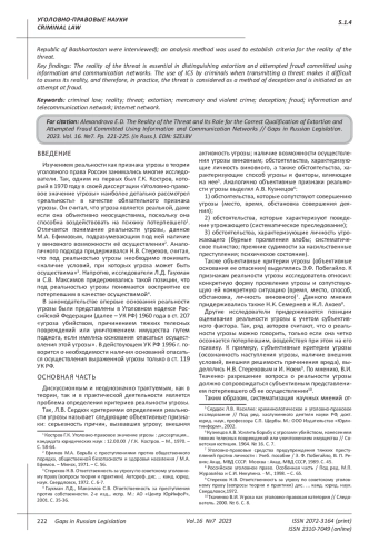 Tkachenko V.I. Threat as a criminal-legal category // Investigator. 2000. No. 6. 4 p.