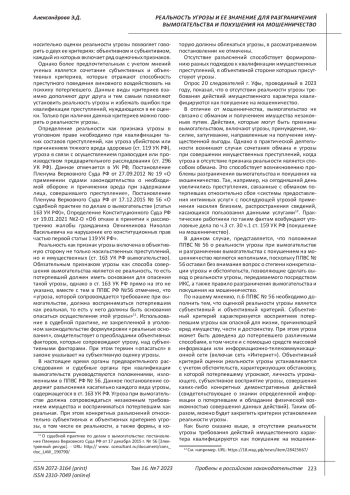 Реальность как признак угрозы включена в объективную сторону не только насильственных преступлений, но и имущественных (ст. 163 УК РФ вымогательство). Обязательным признаком угрозы как способа совершения вымогательства является ее реальность, то есть потерпевший должен иметь основания для опасения такой угрозы, однако в ст. 163 УК РФ прямо на это не указано, вместе с тем в ППВС РФ №56 отмечено, что «угроза, которой сопровождается требование при вымогательстве, должна восприниматься потерпевшим как реальная, то есть у него должны быть основания опасаться осуществления этой угрозы»11. Использование в судебной практике, не закрепленной в уголовном законодательстве формулировки «реальные основания», свидетельствует о преобладании объективных факторов, которые сопровождают угрозу, над субъективными факторами. При этом термин «опасаться» в законе указывает на субъективную оценку угрозы.