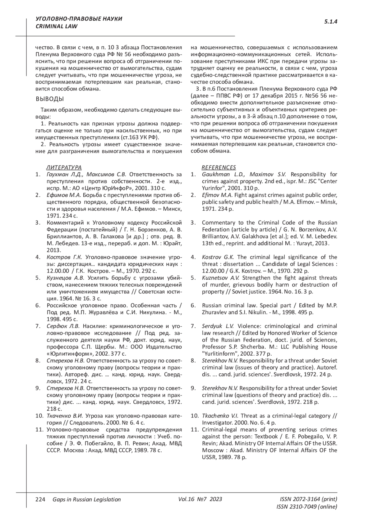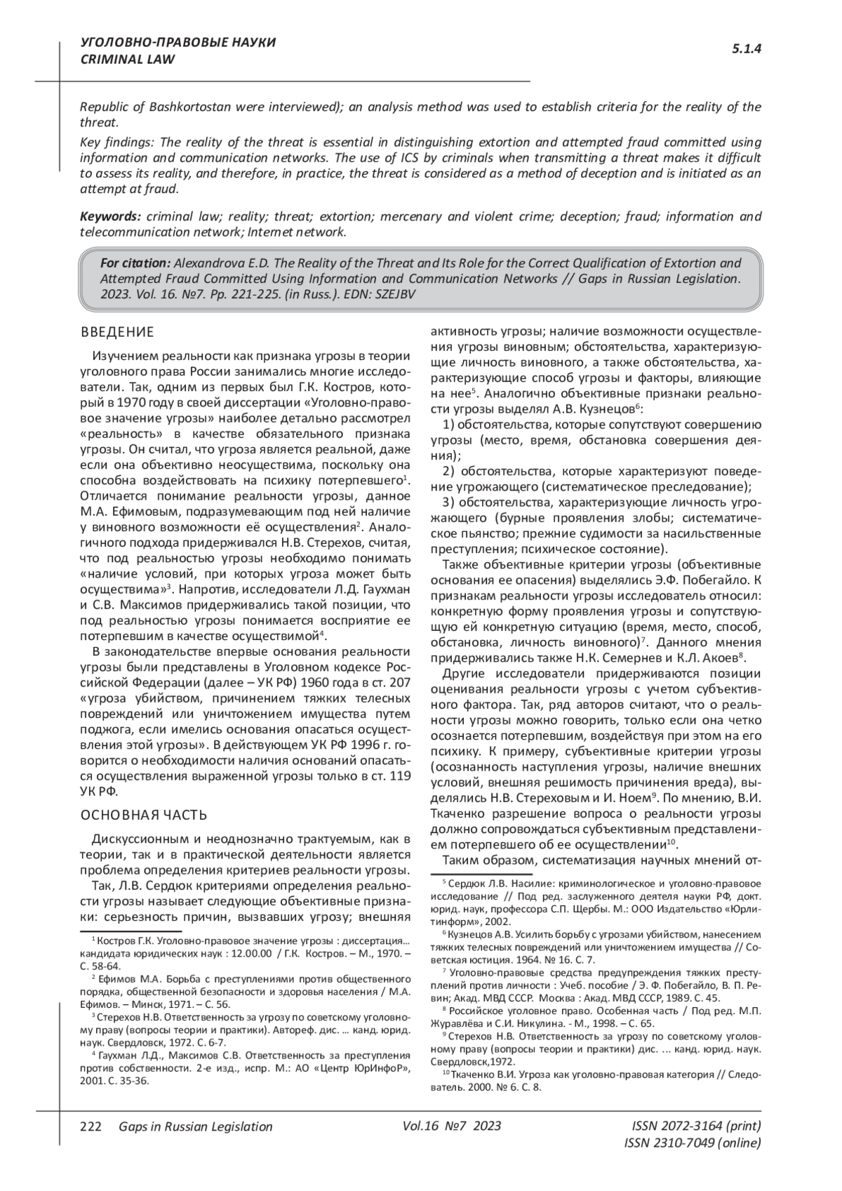 Sterekhov N.V. Responsibility for a threat under Soviet criminal law (questions of theory and practice) dis…. cand. jurid. sciences’. Sverdlovsk, 1972. 218 p.